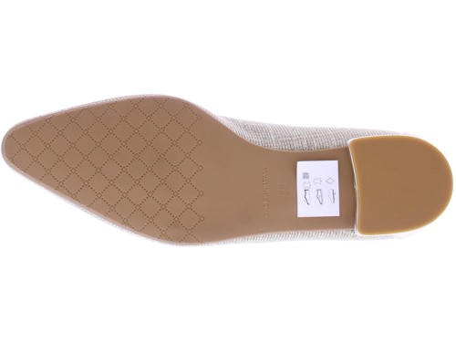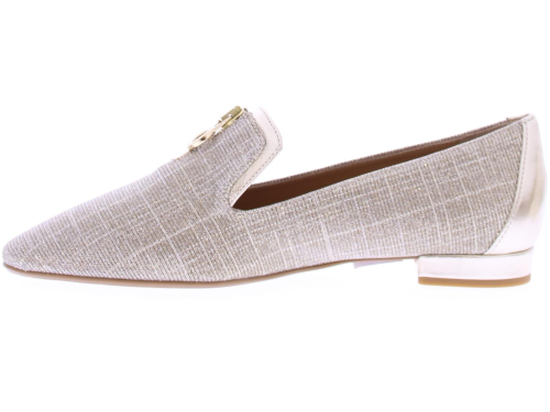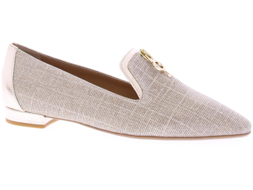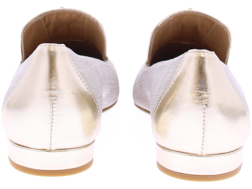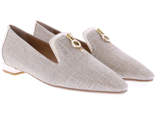 Goud met platinakleurig dames instapper van Nalini. De schoen heeft een goudkleurig detail op de wreef in de vorm van een rits. De hak is 2 cm hoog en de zool is van rubber.