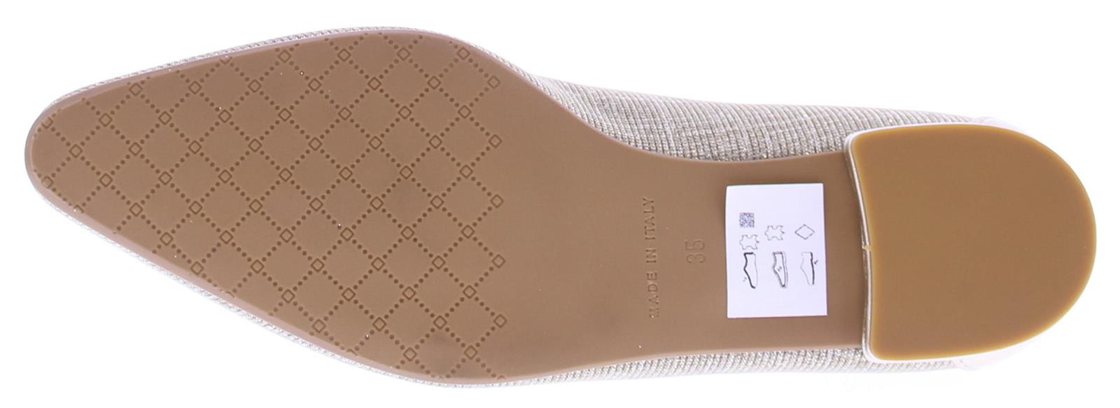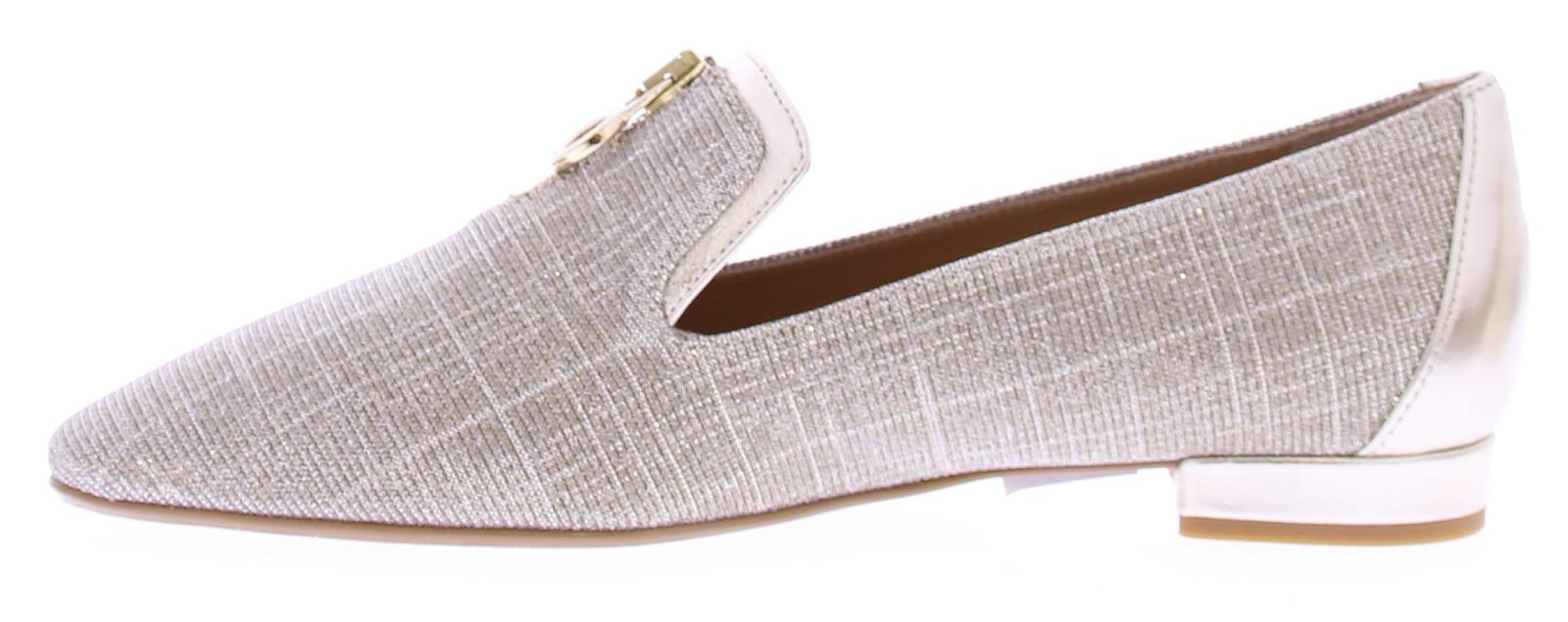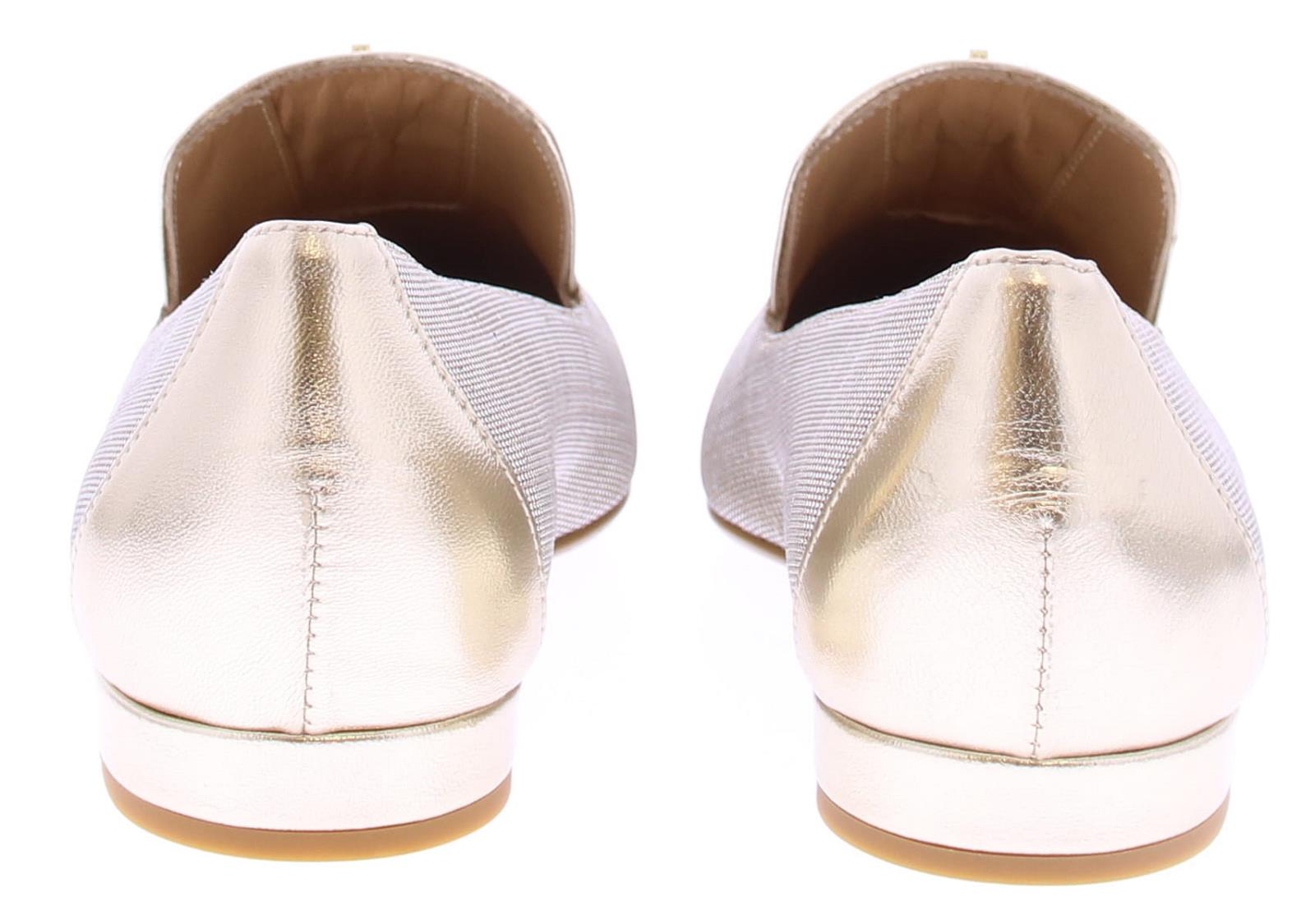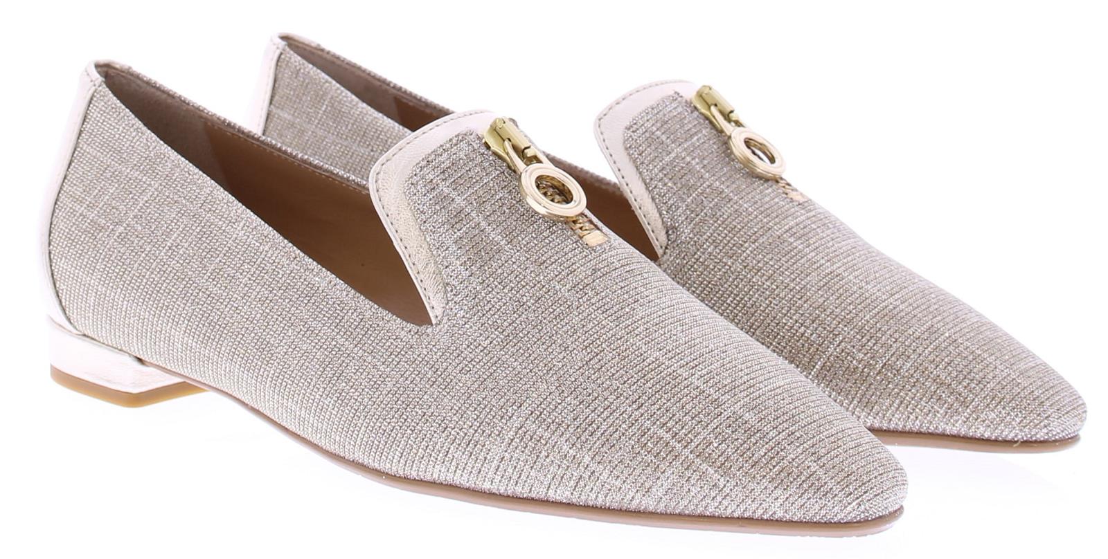 Goud met platinakleurig dames instapper van Nalini. De schoen heeft een goudkleurig detail op de wreef in de vorm van een rits. De hak is 2 cm hoog en de zool is van rubber.