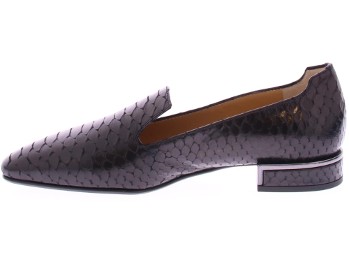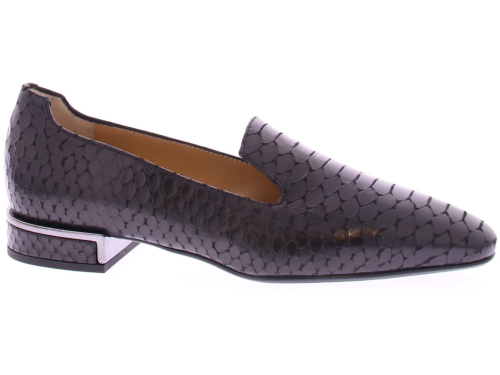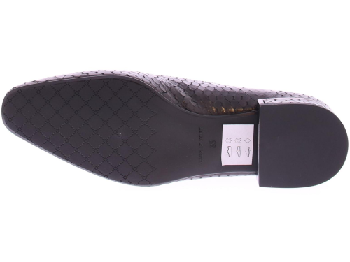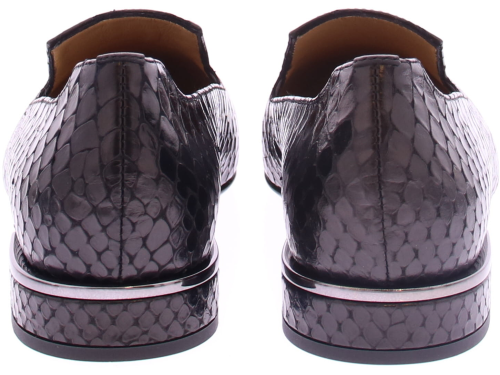 Zwart kalfs leren dames instapper van het merk Nalini. Deze instapper is gemaakt in hoogwaardig zwart kalfsleer met een patroon in slangenprint. En met als detail een zilveren garnering langs de hak. Een mooie loafer met leren voering en een hakhoogte van 2 cm.