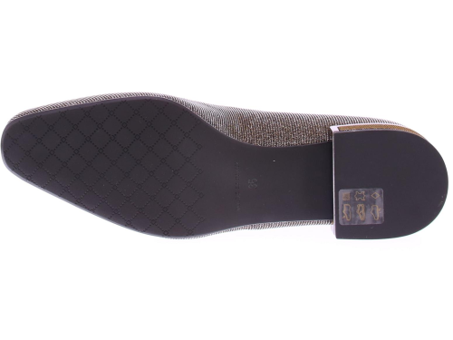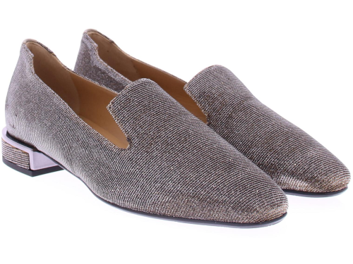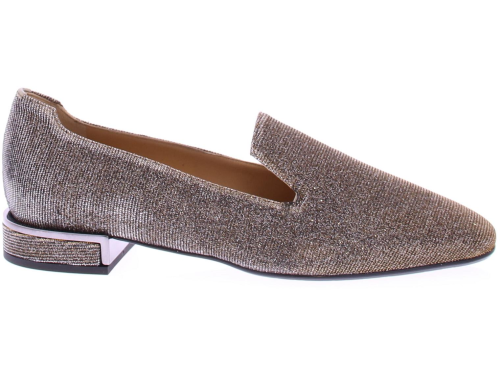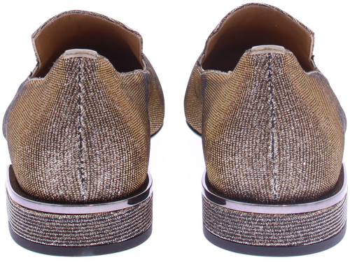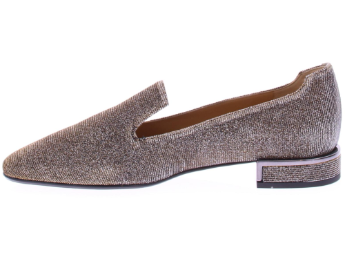 Goud/Platina glitterstof dames instapper van het merk Nalini. Deze instapper heeft als leuk detail een garnering langs de hak. Een mooie loafer met leren voering en een hakhoogte van 2 cm.