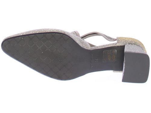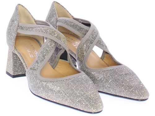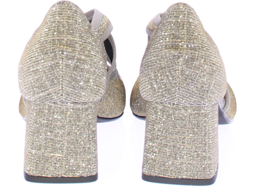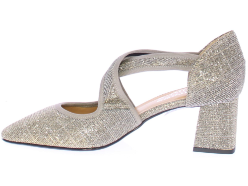 Zilver goud stoffen dames pump met een glinstering van het merk Nalini. Met over de wreef twee sierlijke gekruiste elastieke banden. Uitgevoerd op een comfortabel 5 cm hak en een ovale leest. De pump is leer gevoerd en de zool is van rubber. Een elegante, vrouwelijk schoen met een fijn tussenhakje.