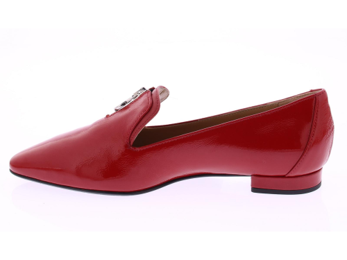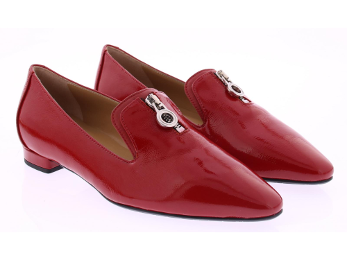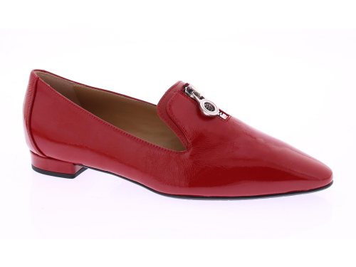 Rood lak dames instapper van Nalini 19I020. Deze loafer heeft op de wreef een zilverkleurig sierritsje. En de klep in afgezet met rood leer. Deze speelse instapper is comfortabel en gekleed tegelijk.