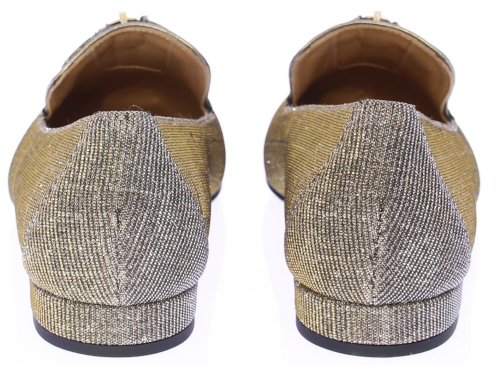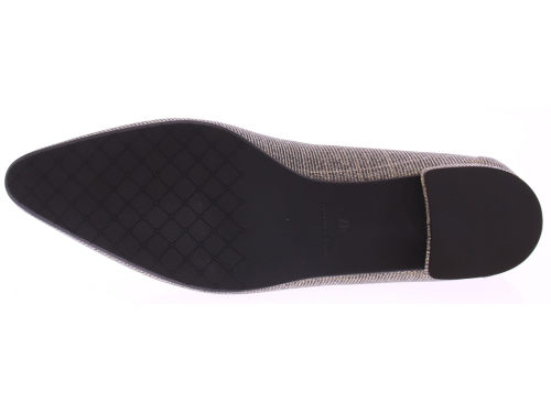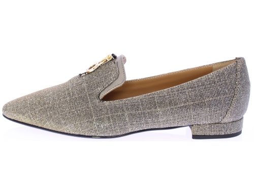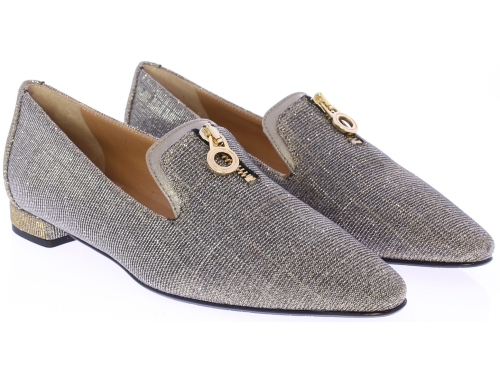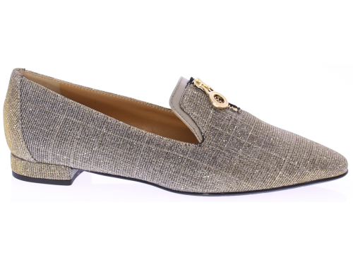 Goudkleurige stoffen dames instapper van Nalini. Deze stijlvolle loafer combineert elegantie met een speelse twist. De schoen is vervaardigt uit goudkleurige glitterstof met brons leren accenten. De voering is van leer en de zool van rubber. Het goudkleurige sierritsje op de wreef geeft de schoen een speelse en luxe uitstraling. Perfect voor wie stijl en comfort wil verenigen in een schoen.