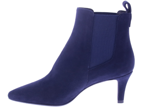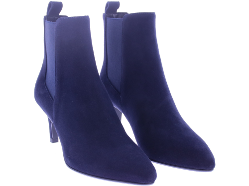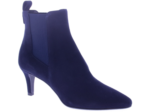 Donkerblauw suede dames enkellaars van Nalini. Vervaardigt uit luxe Italiaans kalfssuede. Dit korte laarsje heeft een elegante spitse neus en mooie slanke hak van 6 cm, ideaal voor zowel zakelijke outfits als een avondje uit. Dankzij de elastische zijpanelen is instappen eenvoudig, terwijl de nausluitende pasvorm een vrouwelijke look garandeert.