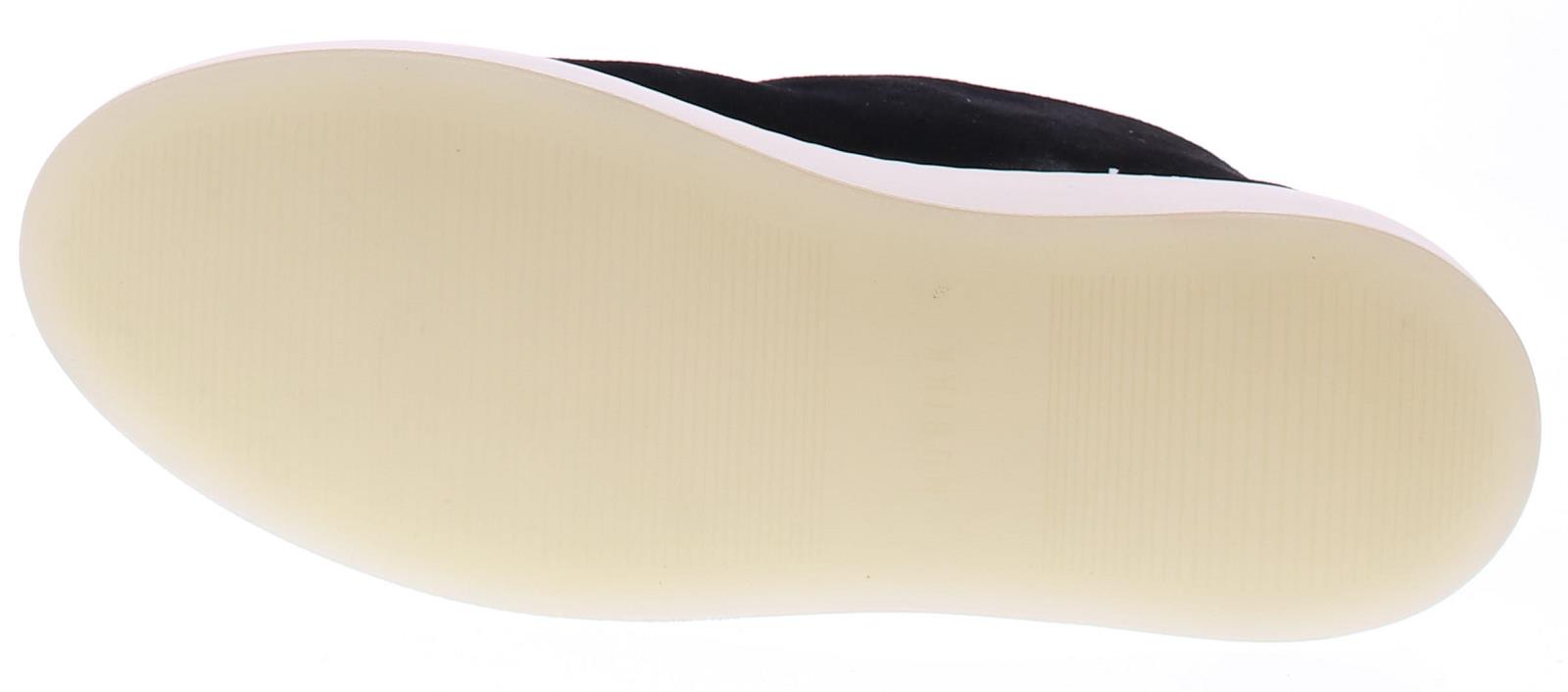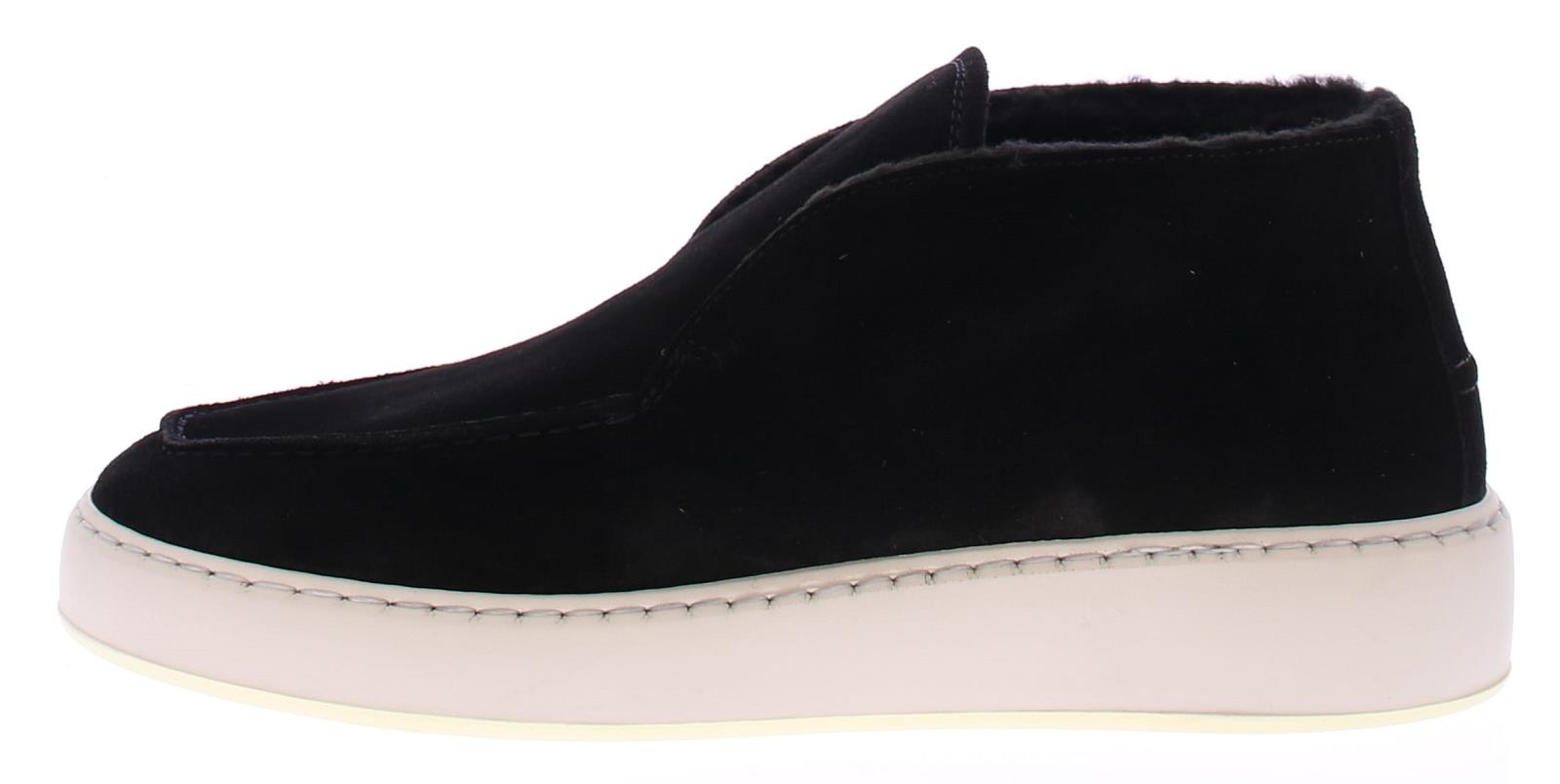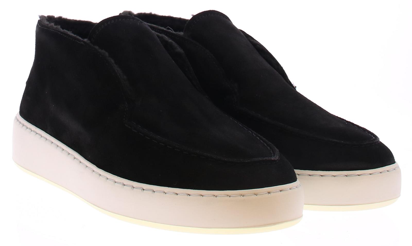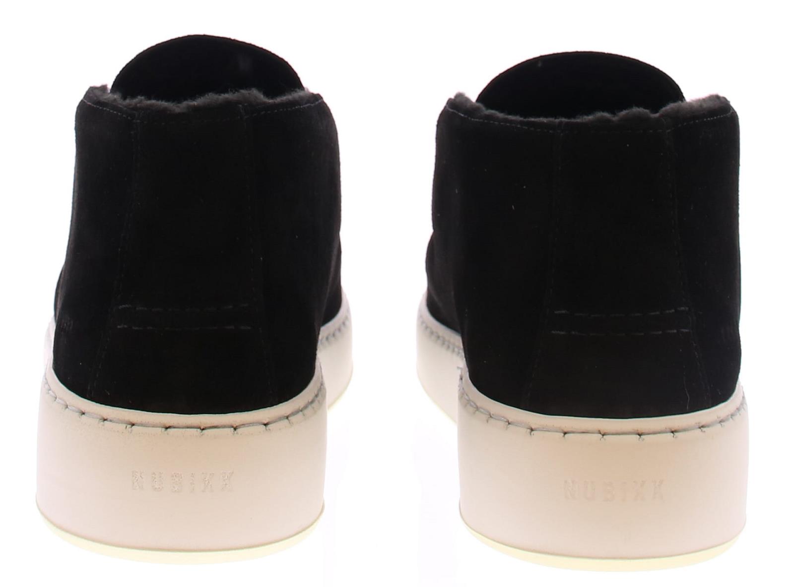 Enkelhoge instapper van Nubikk in zwart suede met stoffen voering op een sportieve witte rubber zool.