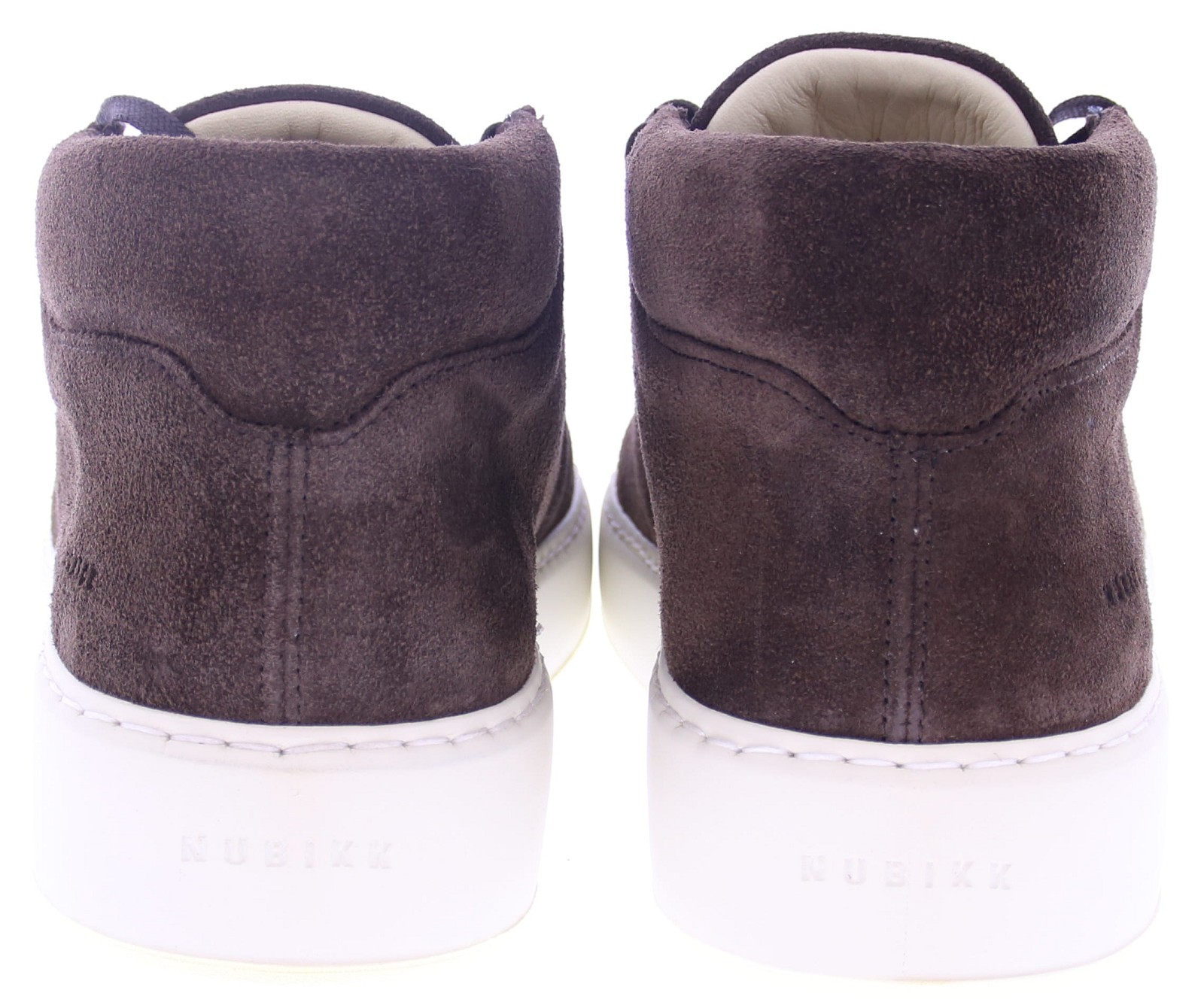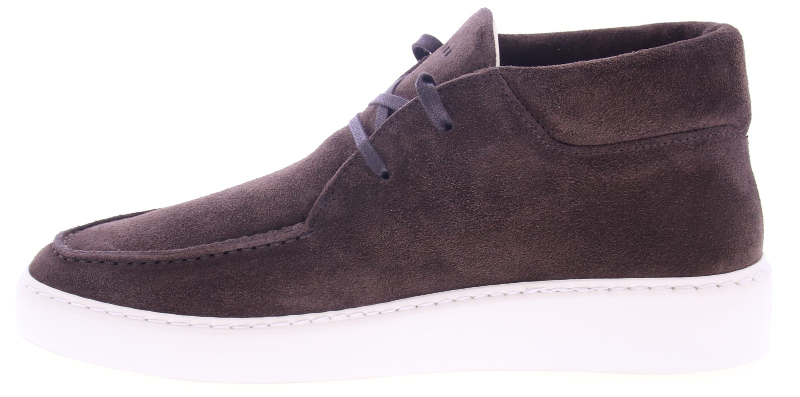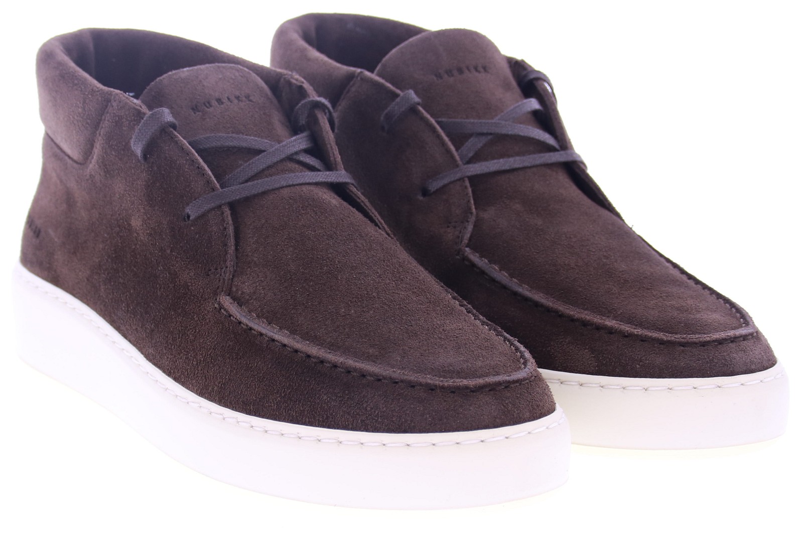 Heren enkelboot van Nubikk artikel Jiro Gio uitgevoerd in donker bruin suède op een sportieve witte rubber zool. De voering is van leer en het voetbed uitneembaar.