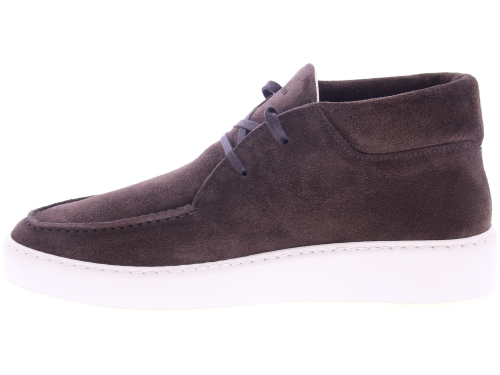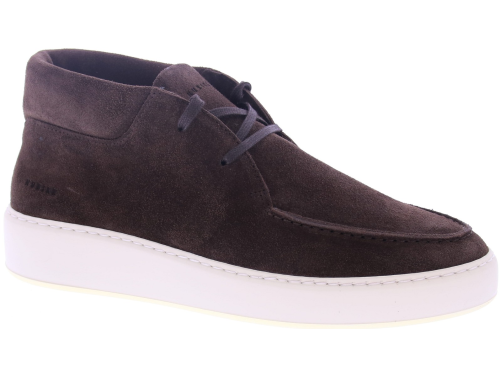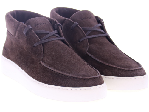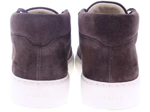Heren enkelboot van Nubikk artikel Jiro Gio uitgevoerd in donker bruin suède op een sportieve witte rubber zool. De voering is van leer en het voetbed uitneembaar.
