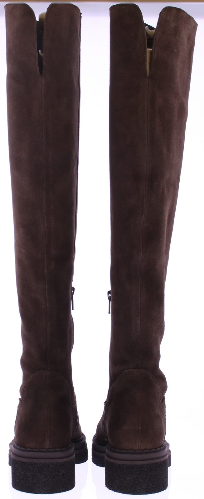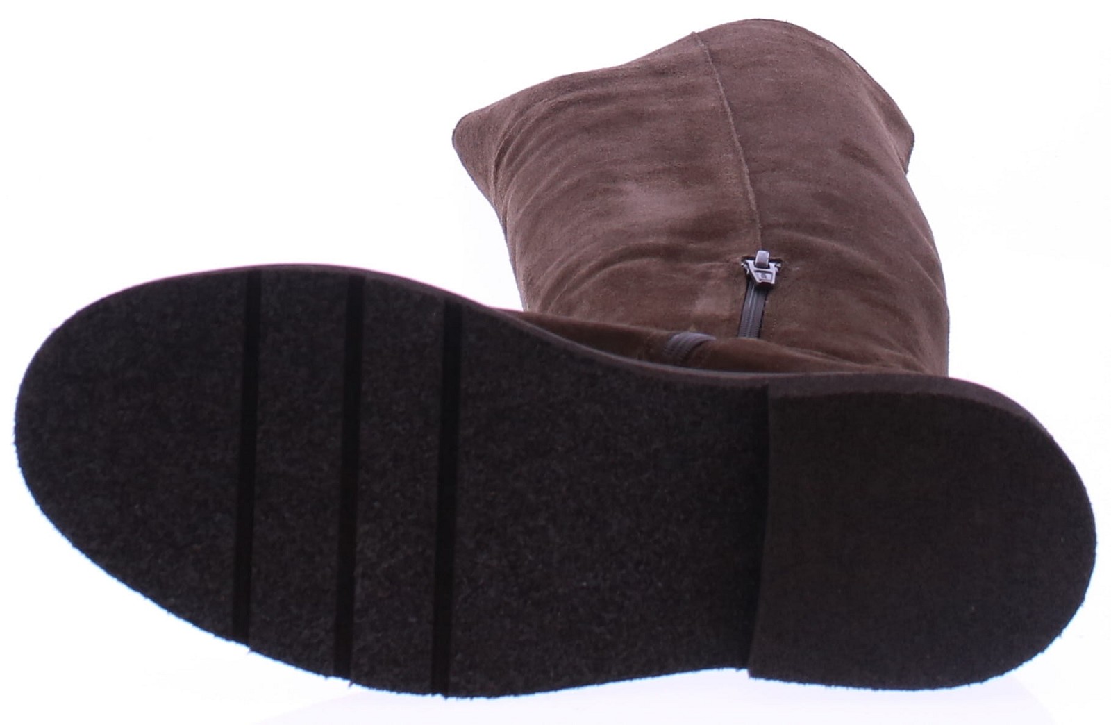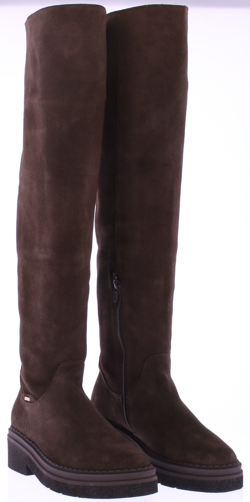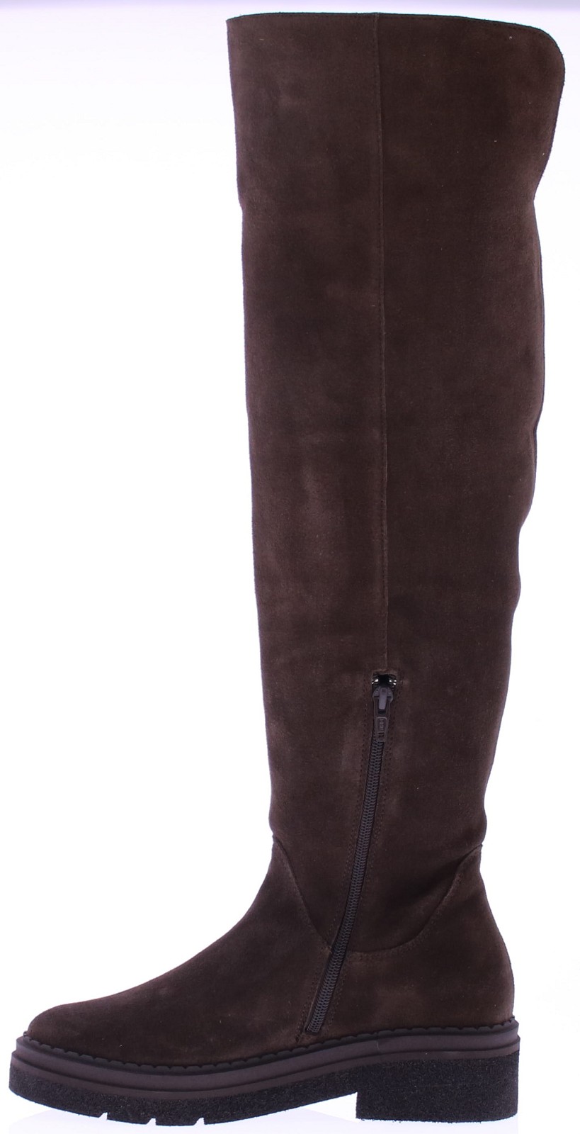 Donkerbruin suede lange dameslaars van Nubikk. Deze laars heeft een hoge schacht tot net op de knie. De 3/4 rits zorgt voor een makkelijke instap, terwijl de grove rubberen zool zorgt voor een stevige basis en een stoere uitstraling. Het leren voetbed is uitneembaar.