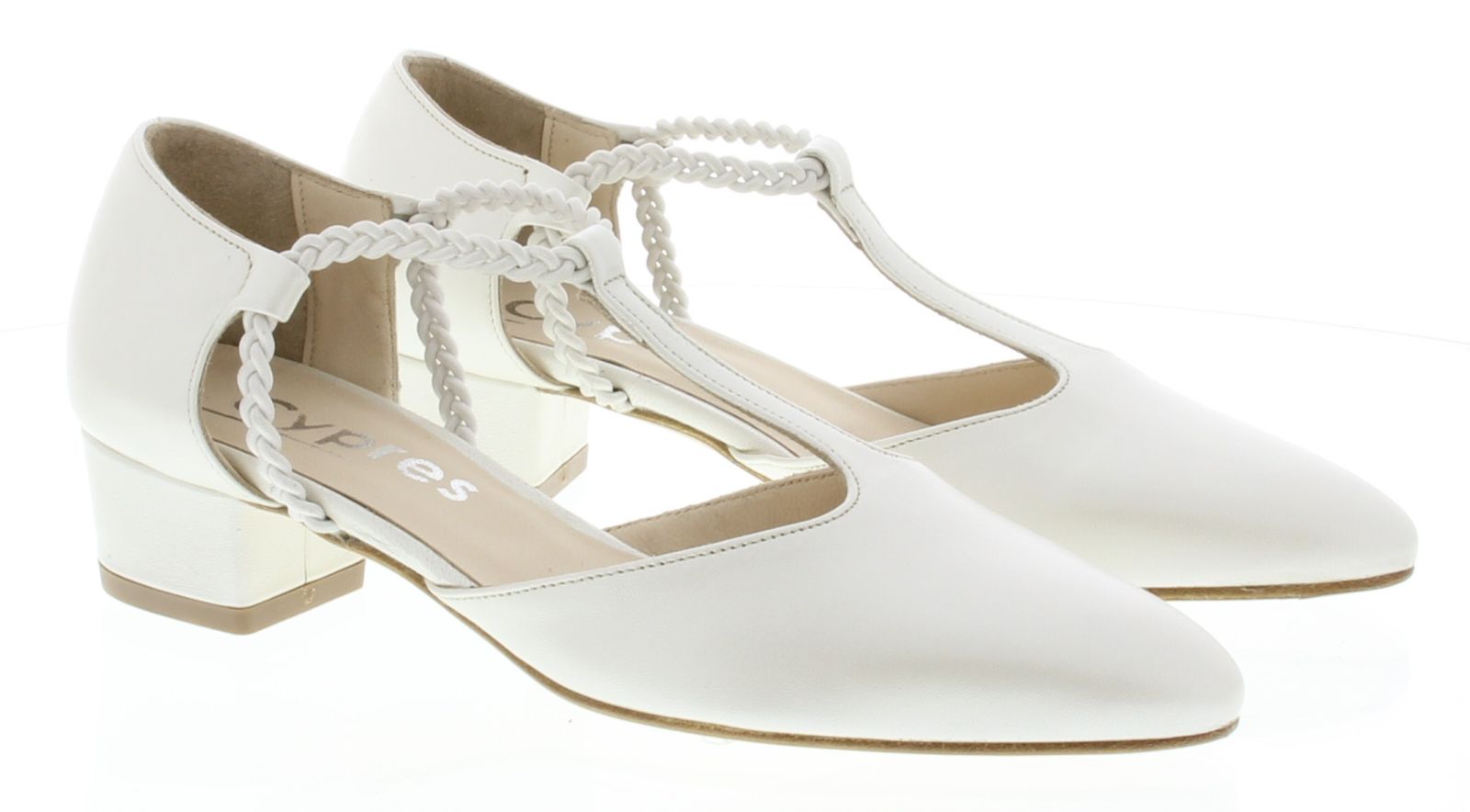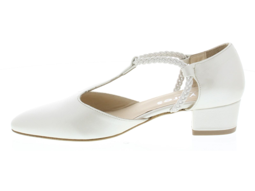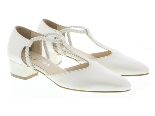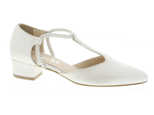 Parelmoerkleurige leren dames pump van CYPRES. De pump heeft een spitse neus en is opgewerkt aan de zijkanten. De pump heeft een T-band met elastiek over de voet zodat hij goed aan de voet blijft zitten, voor extra comfort heeft de pump een bredere hak van 4 cm.