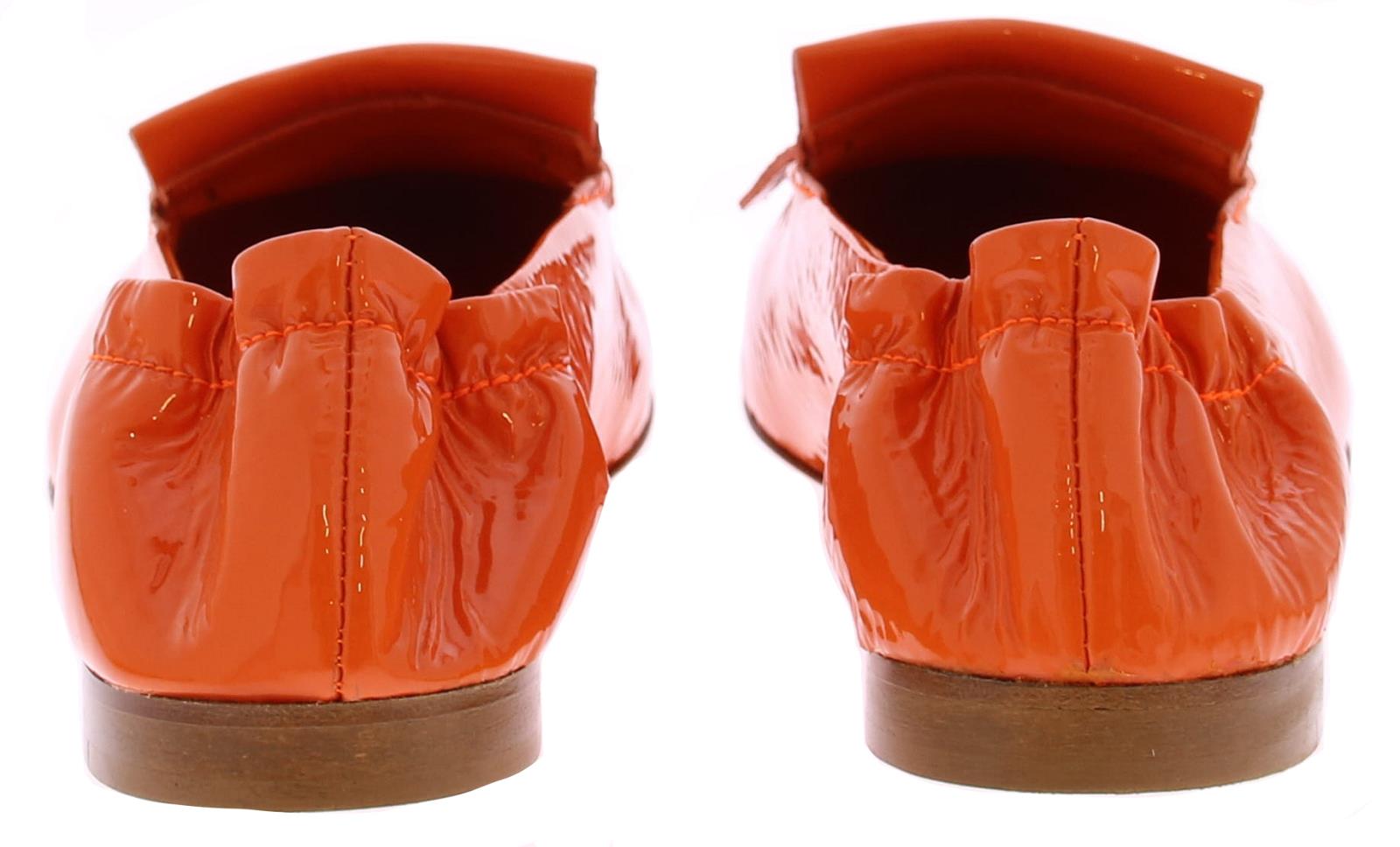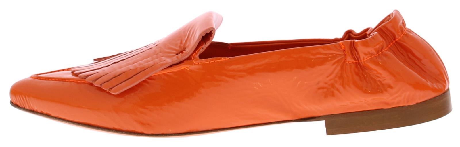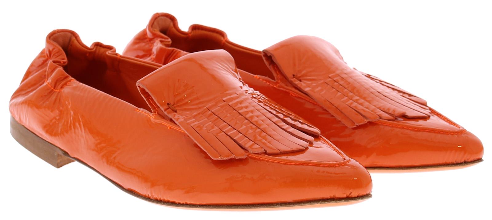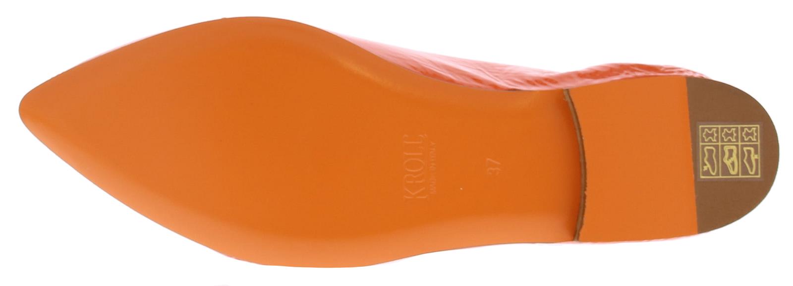 Oranje lakleren dames instapper van het Italiaanse merk Kroll. Deze exclusieve instapper heeft een slanke puntige neus versierd met een bandje franjes. De hiel is voorzien van elastiek zodat de schoen mooi om de voet sluit en makkelijk aan te trekken is. De voering is volledig van leer.