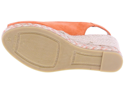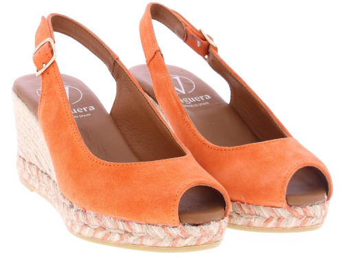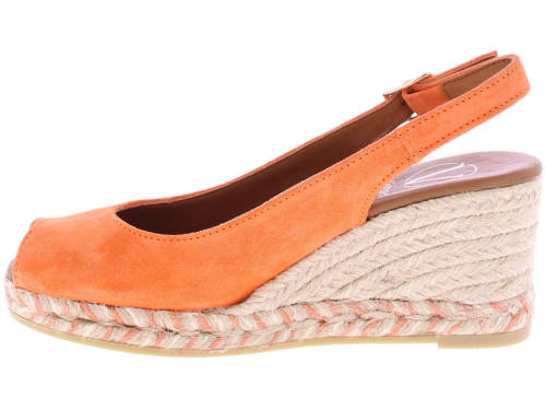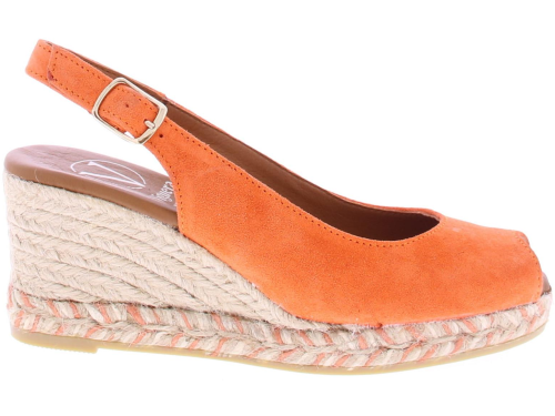 Oranje suede dames espadrille van Viguera. Uitgevoerd als sandaal op een sleehak met in de zoolrand ook dezelfde leuke oranje kleur. Het zachte luxe voetbed is van leer en het hielbandje is verstelbaar met een gespje.
