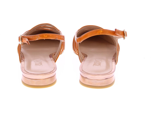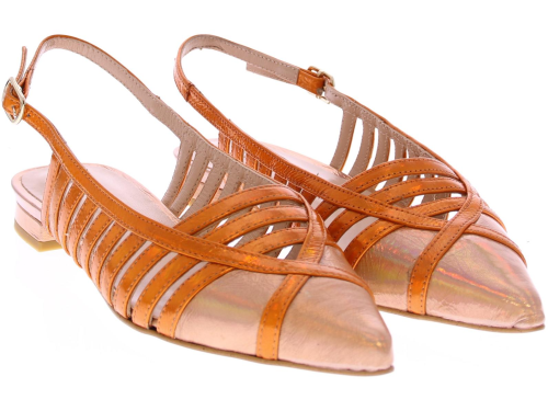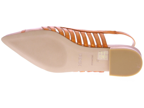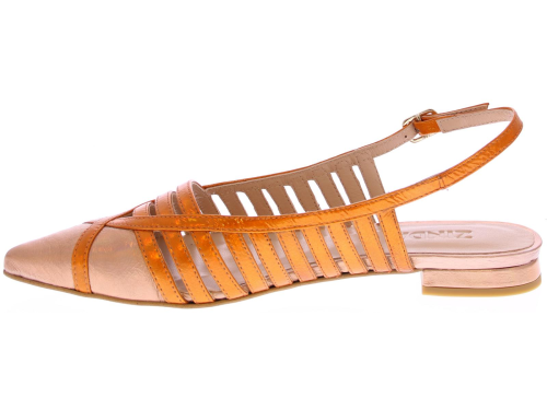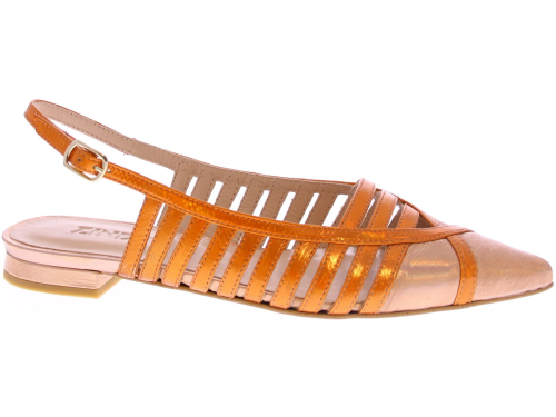 Oranje met nude metallic dames slingback van Zinda. Origineel afgewerkt met fijne reepjes leer aan de zijkant. Het hakje is 2 cm hoog. Het hielbandje is verstelbaar.
