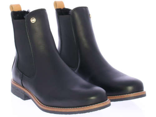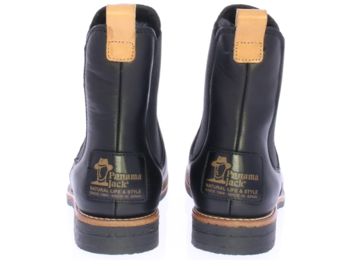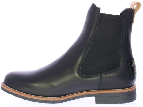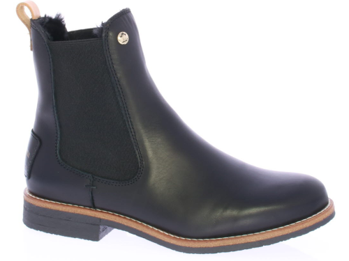Zwarte leren dames Chelseaboot van Panama Jack. Deze laars is gevoerd met schapenvacht en behoudt daarmee de lichaamstemperatuur. Deze laars komt op een rubberen zool en heeft een treklus aan de hiel voor een gemakkelijke instap. Het leer is waterresistant.