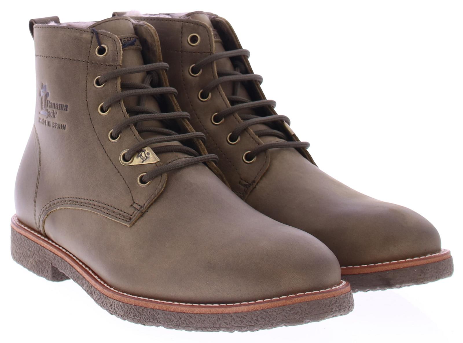 Khaki kleurige leren heren veterboot van Panama Jack. Dit op bergsport geïnspireerde model heeft een bovenwerk van waterproof gevet nappa leer met een warme binnenvoering.