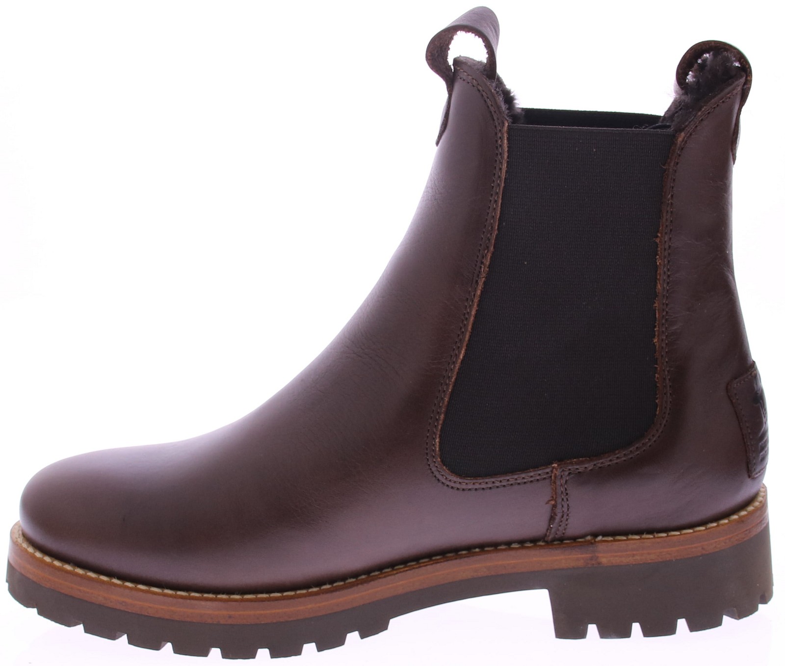 Donkerbruin leren dames boots van Panama Jack. Deze robuuste en vrouwelijke boots zijn gemaakt van hoogwaardig bruin leer en combineren moeiteloos comfort met fashion. De elastische zijkanten zorgen voor een flexibele pasvorm, terwijl de handige aantreklussen het instappen extra gemakkelijk maken. De zachte sheepskin binnenvoering houdt je voeten heerlijk warm op koude dagen. De opvallende licht gestikte zool geeft de laars een stoere en eigentijdse uitstraling. Het voetbed is uitneembaaren de rubberen zool heeft een grof profiel.