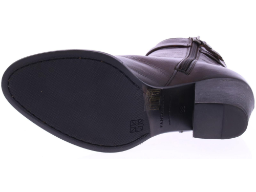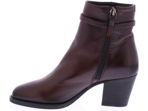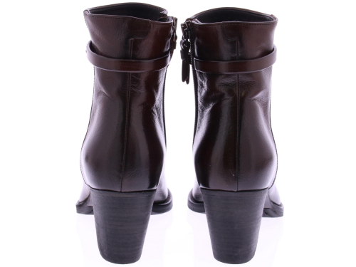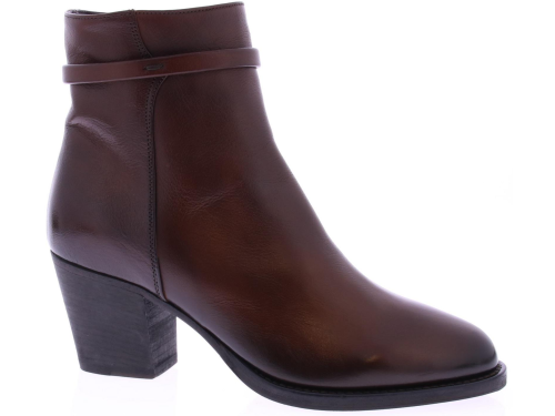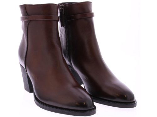 Rood-bruin leren dames enkellaars van Pantanetti. Met om de enkel een versiering van een smal leren bandje. De schoen is geheel hand gekleurd en heeft een zool van leer met rubber op het slijtvlak. De voering is leer. Heeft een hakhoogte van 6 cm