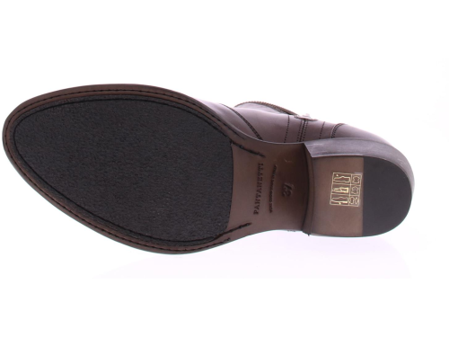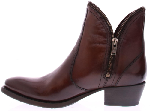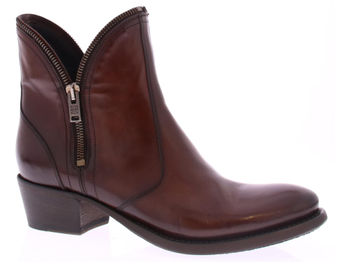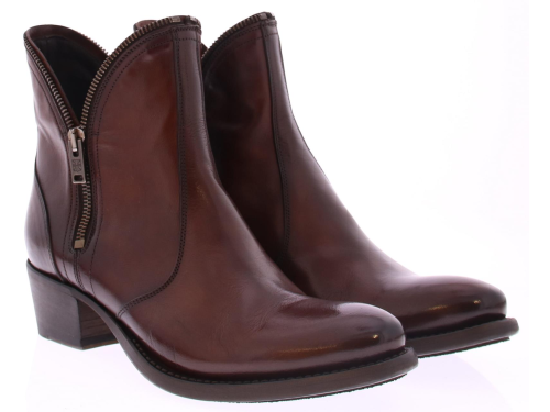 Dames enkellaars van Pantanetti in roodbruin buffelleer met 2 ritsjes die rondom het bovenwerk lopen. De schoen heeft een leren voering en zool van leer met rubber sltijtvlak.