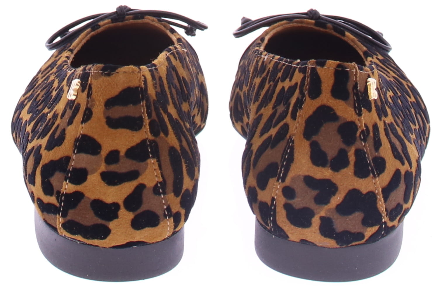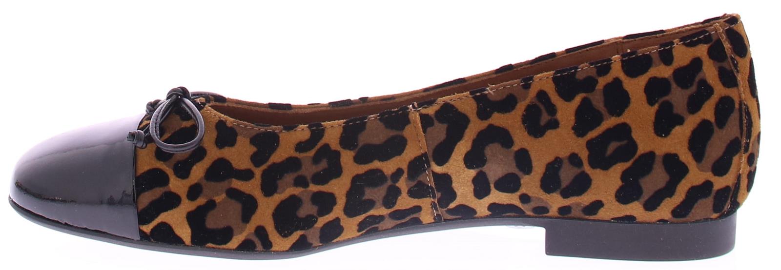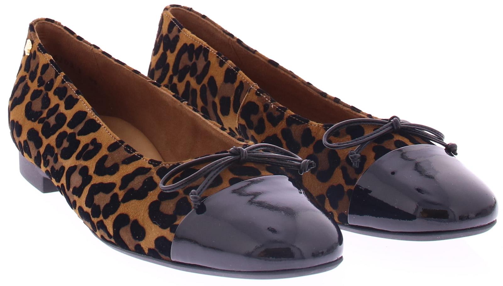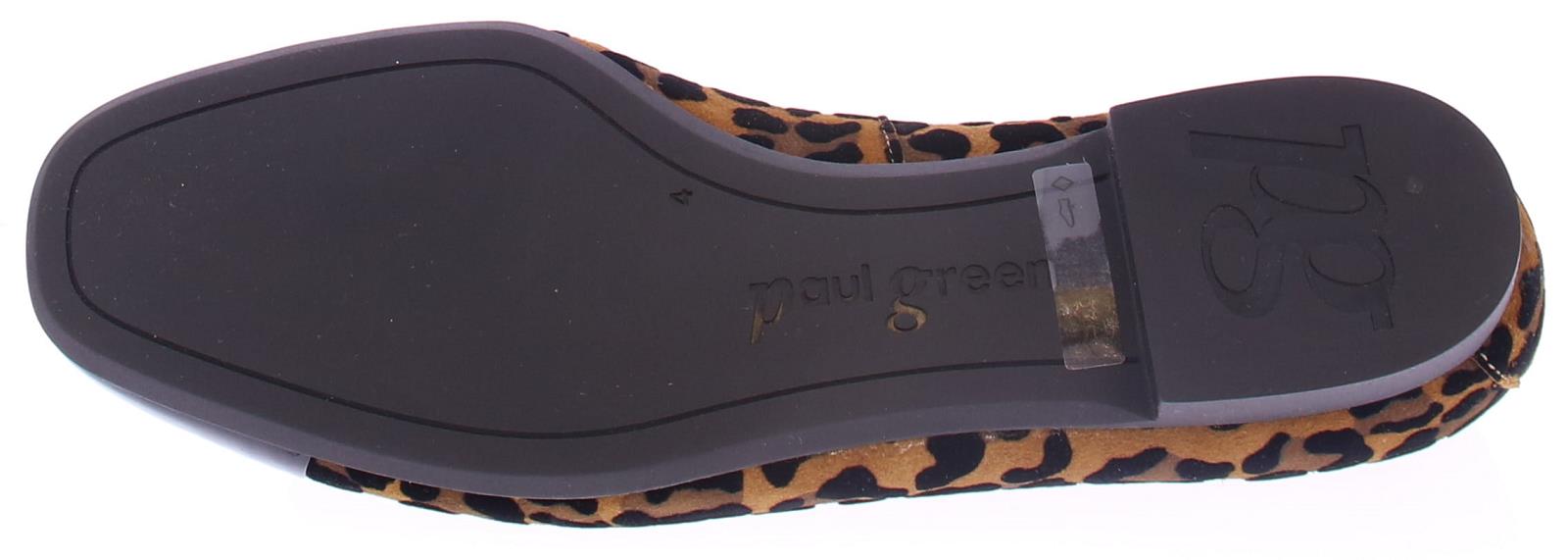 Beige met zwarte leopard print leren dames ballerina van Paul Green. De neus is afgezet met zwart lak en versierd met een subtiele strik. De ballerina heeft een lichte leren voering en een rubberen loopzool. De hakhoogte is 2 cm.