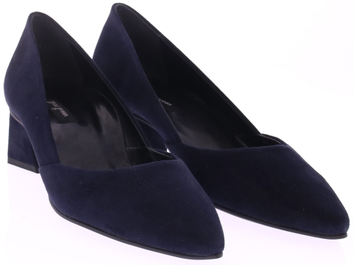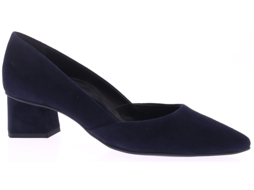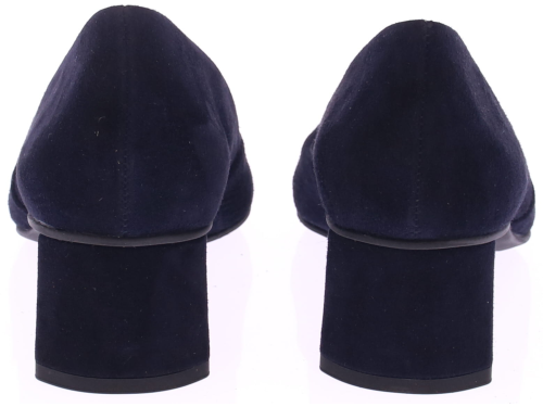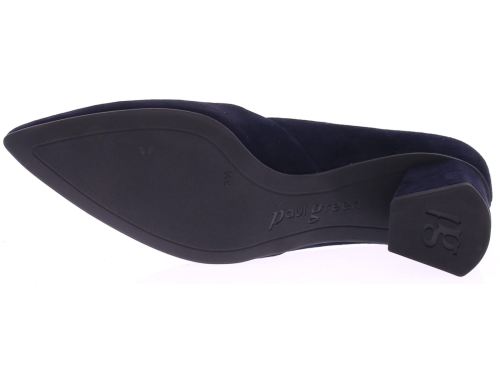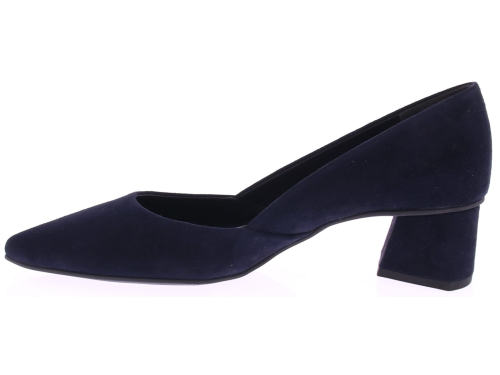 Donkerblauwe pump van Paul Green (model 3815.078). Uitgevoerd in hoogwaardig suède, heeft deze schoen een leuke hak in de vorm van een driehoek en is 4 cm hoog. De leren voering en het zachte voetbed bieden optimaal draagcomfort, zelfs bij langdurig gebruik. Het hoge voorblad omsluit de voet mooi, terwijl de subtiele, lage uitsnijding aan de zijkant een verfijnde en vrouwelijke touch geeft.
