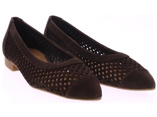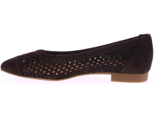 Donkerbruin suède ballerina's van Paul Green. Deze ballerina is opengewerkt met aan de binnenkant fijn gaas, wat zorgt voor een luchtige uitstraling. De neus is leer gevoerd. De hak heeft een hoogte van 2 cm en de rubberen zool biedt een goede grip en loopcomfort. Een stijlvolle keuze die moeiteloos combineert met zowel een jurk als een casual outfit.