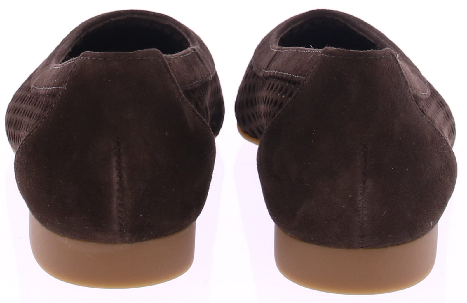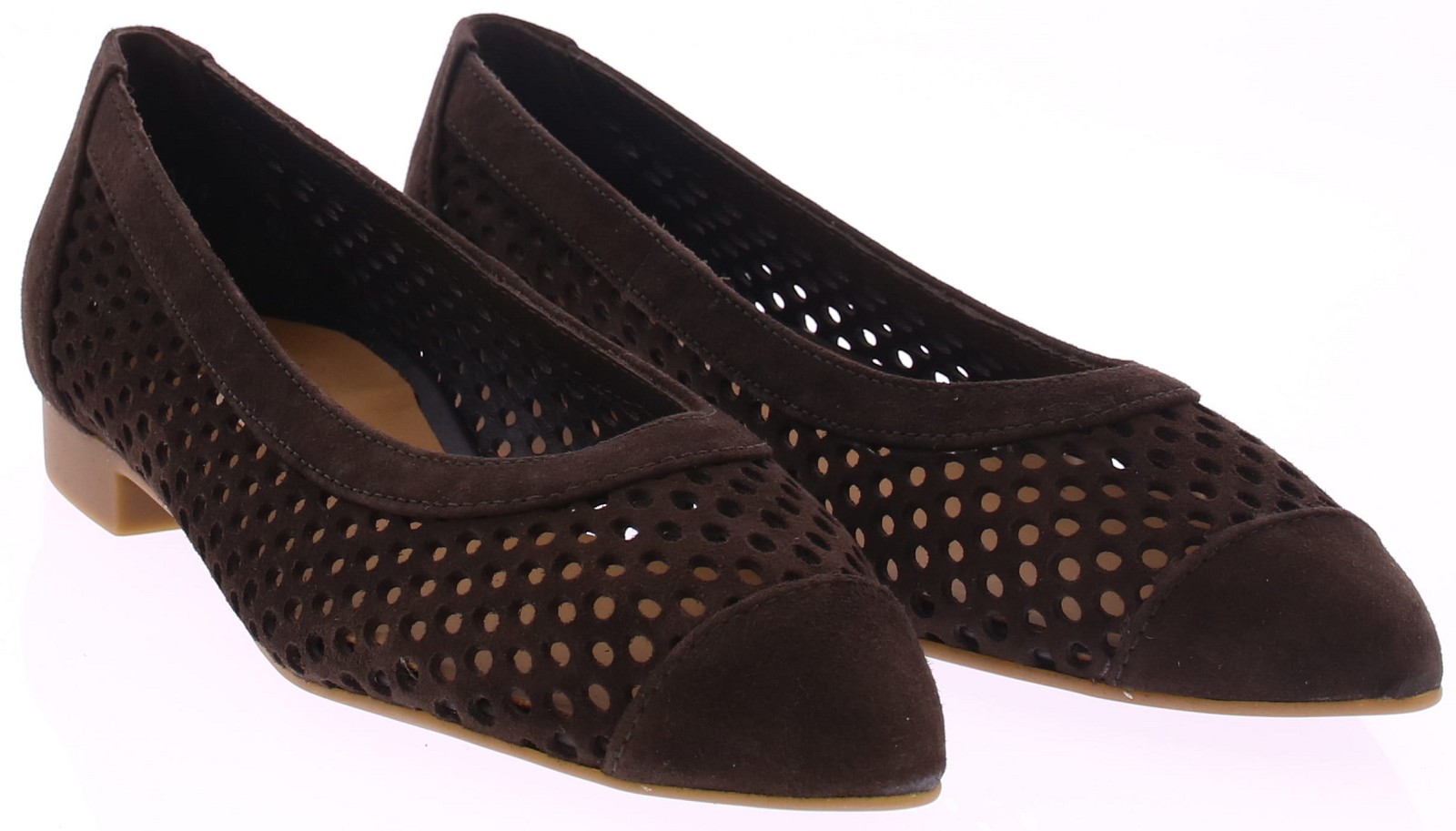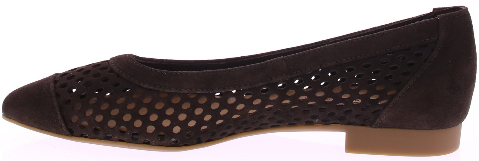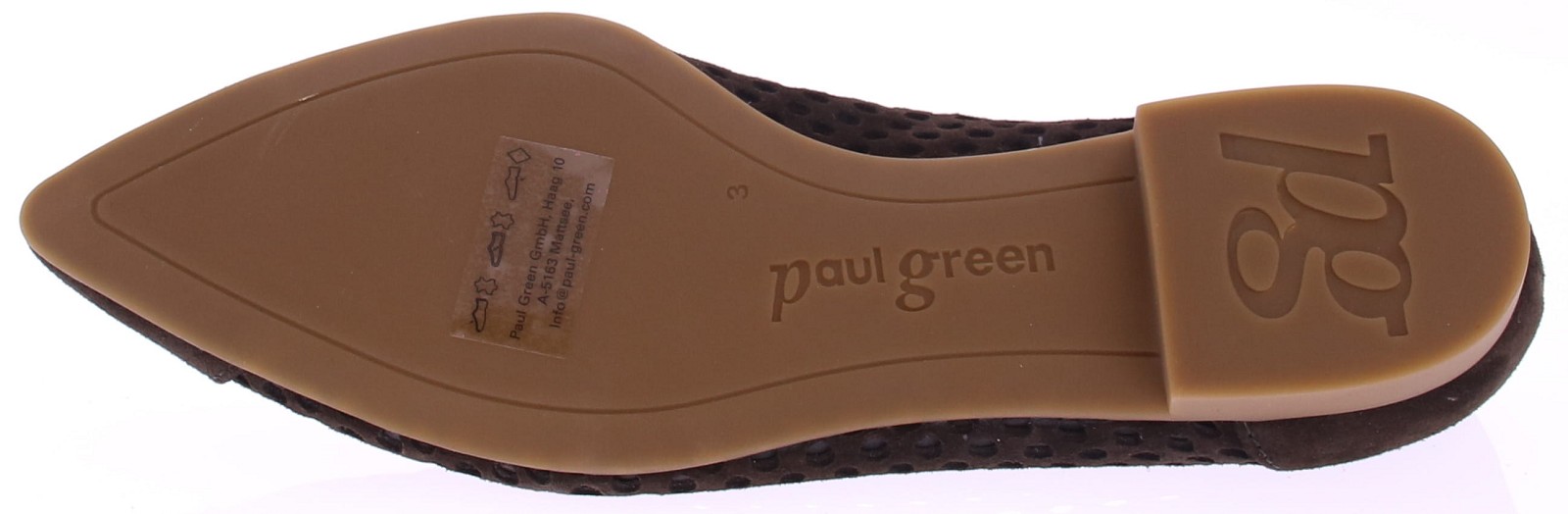 Donkerbruin suède ballerina's van Paul Green. Deze ballerina is opengewerkt met aan de binnenkant fijn gaas, wat zorgt voor een luchtige uitstraling. De neus is leer gevoerd. De hak heeft een hoogte van 2 cm en de rubberen zool biedt een goede grip en loopcomfort. Een stijlvolle keuze die moeiteloos combineert met zowel een jurk als een casual outfit.