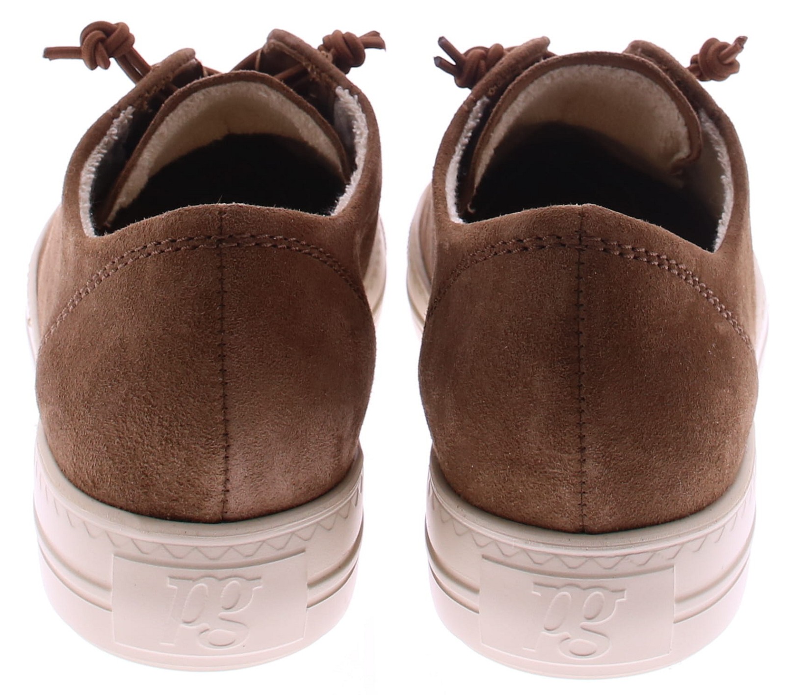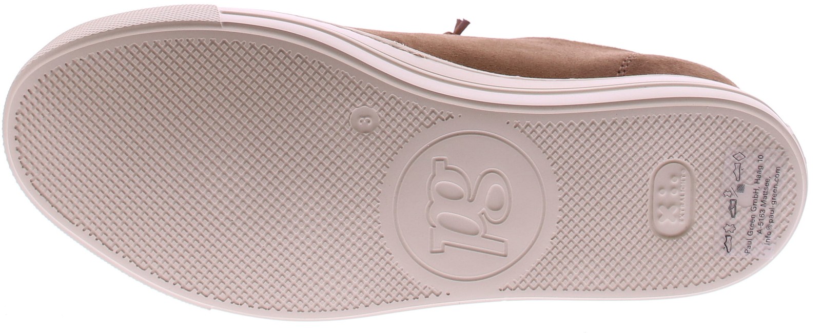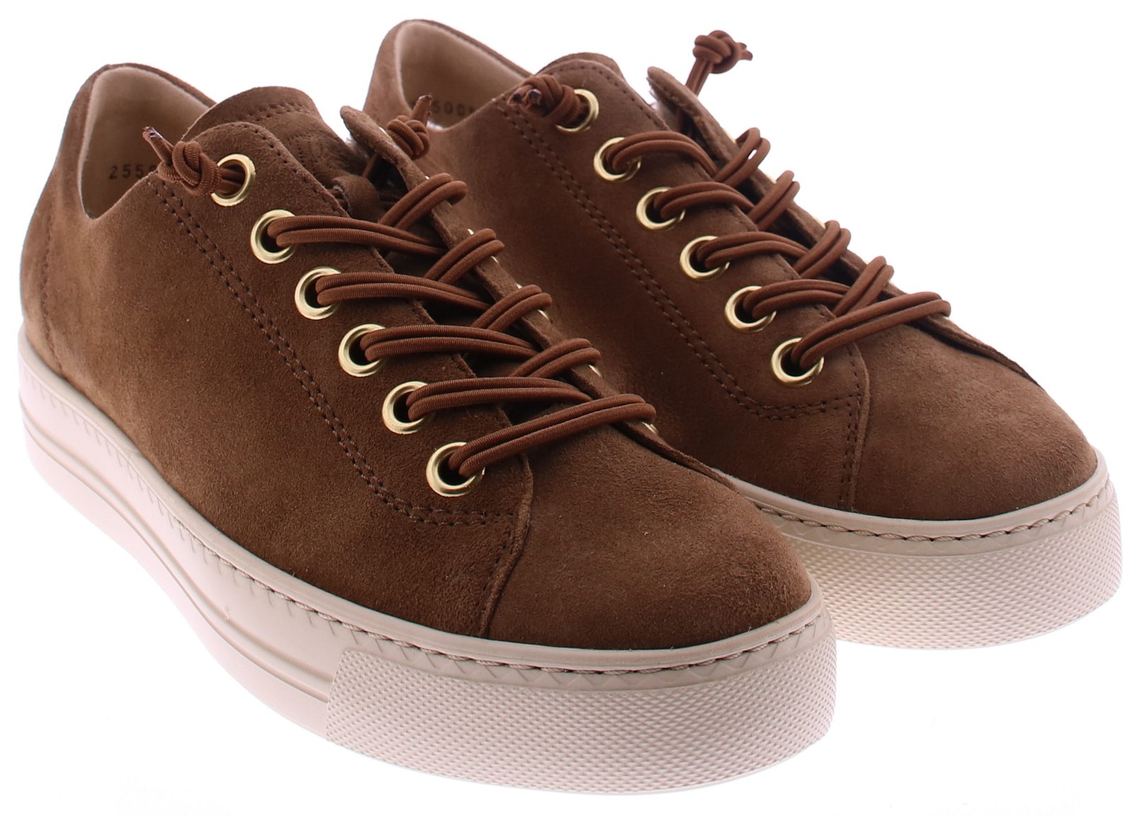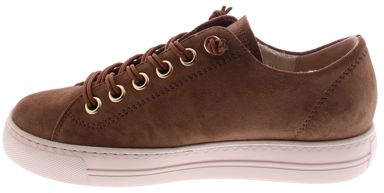 Middenbruin suède dames sneakers van Paul Green. Deze sneaker heeft een beige plateauzool van 2 cm hoog, wat zorgt voor een subtiel contrast. De elastische veters maken de instap gemakkelijk en zorgen voor een comfortabele pasvorm. Gemaakt van zacht suède en afgewerkt met de kenmerkende kwaliteit van Paul Green, perfect voor dagelijks gebruik met een stijlvolle twist.