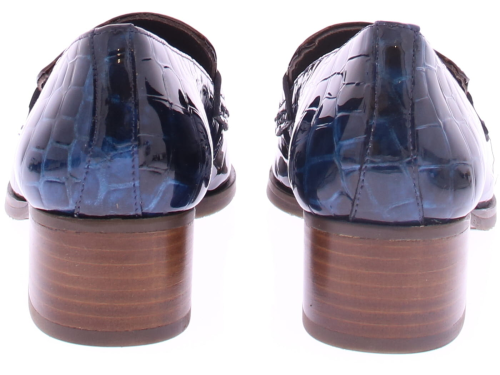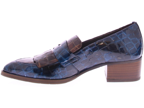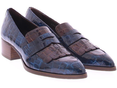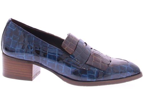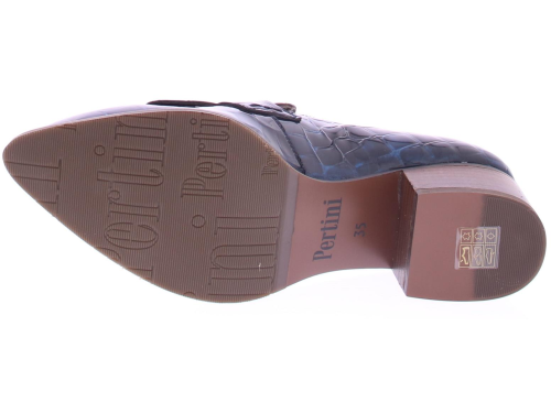 Bruin met blauw crocoprint lak leren dames instapper van Pertini. Deze instapschoen is uitgevoerd in gecombineerd leer met laklook en dierenprint in de kleuren bruin en blauw. De schoen heeft een bandje over de wreef met jamboree klep. De hak heeft een hoogte van 4 cm
