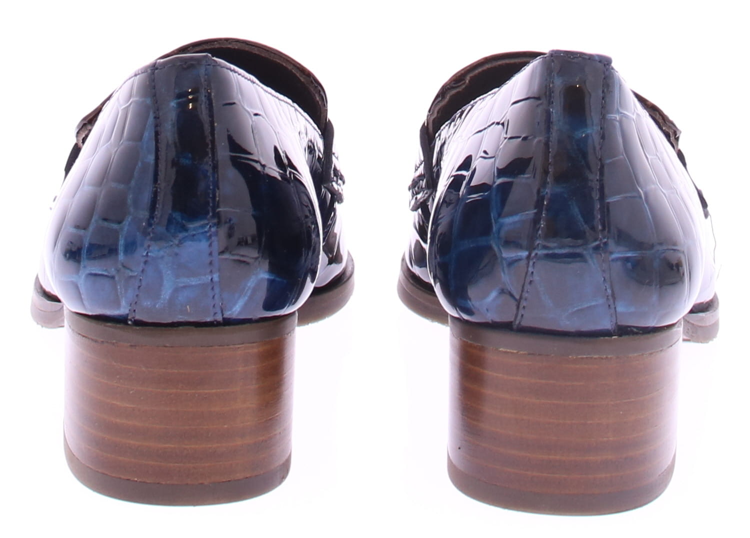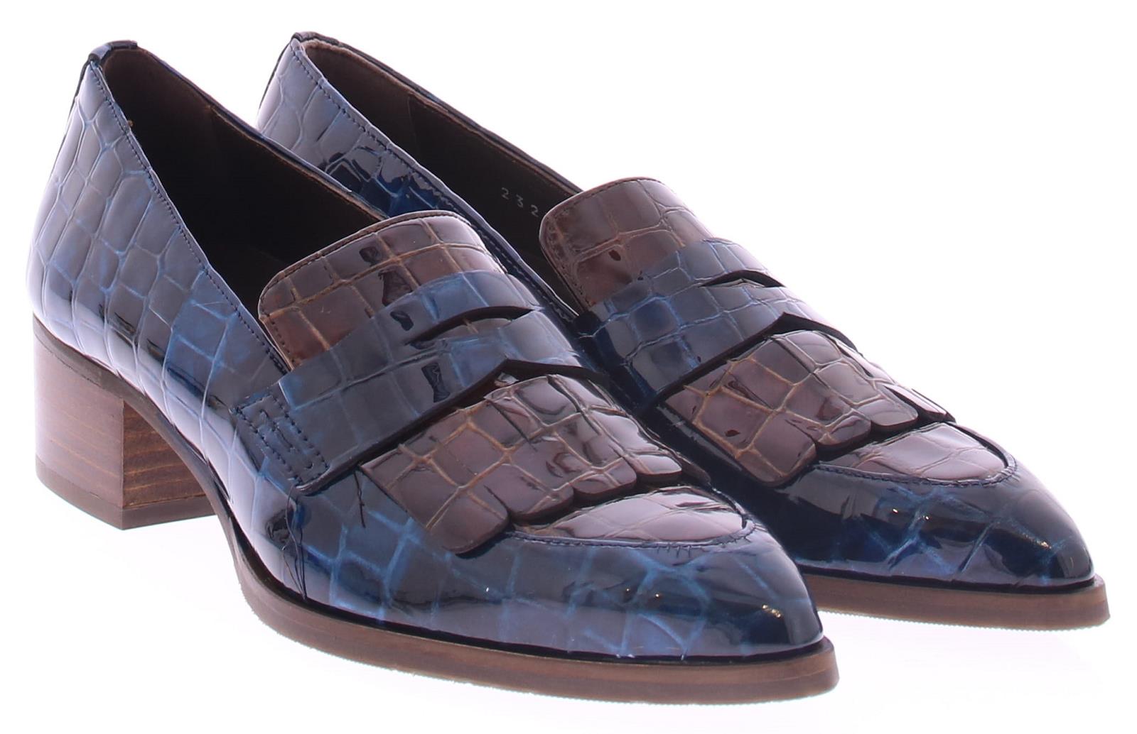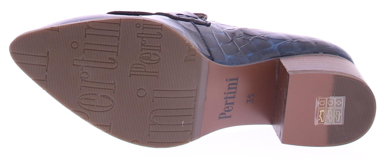 Bruin met blauw crocoprint lak leren dames instapper van Pertini. Deze instapschoen is uitgevoerd in gecombineerd leer met laklook en dierenprint in de kleuren bruin en blauw. De schoen heeft een bandje over de wreef met jamboree klep. De hak heeft een hoogte van 4 cm