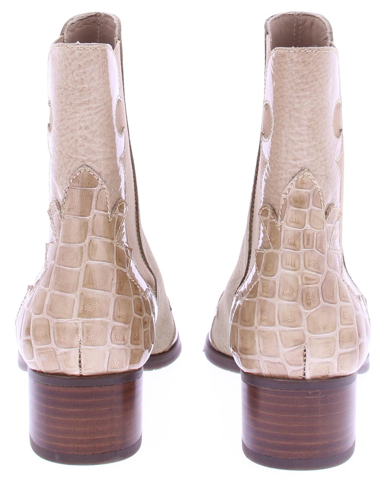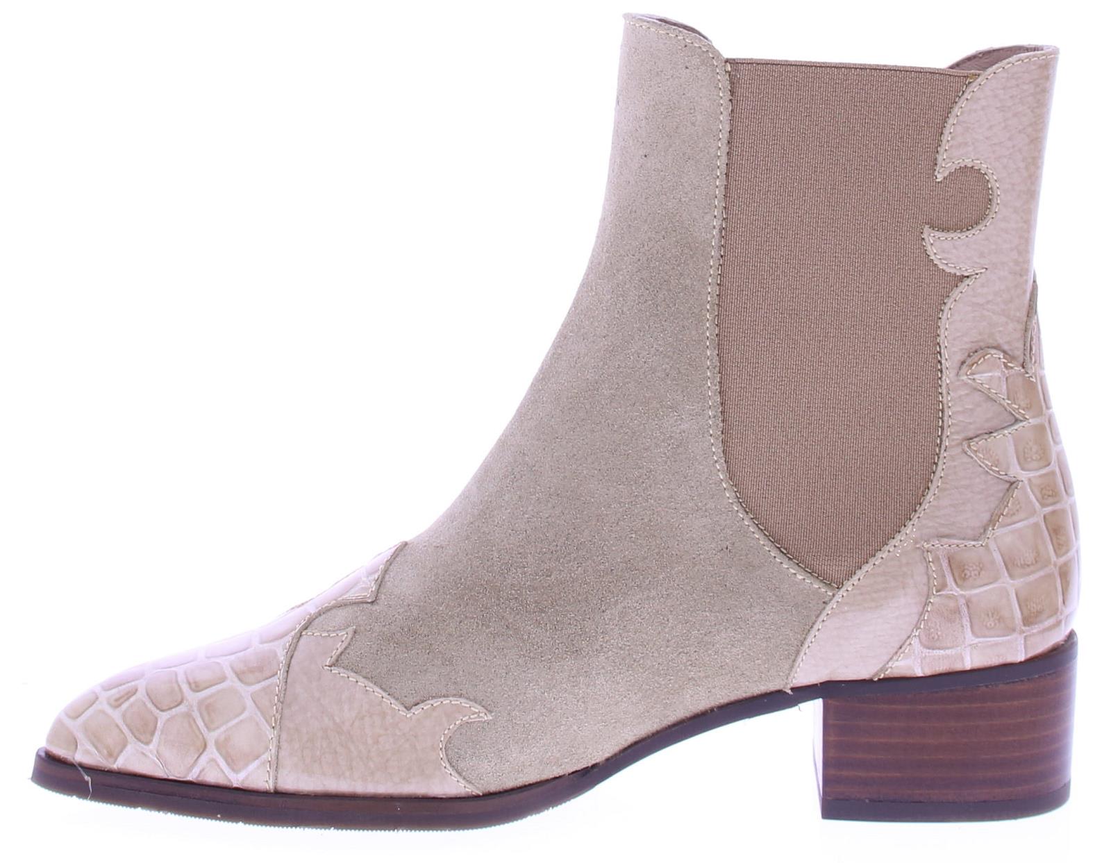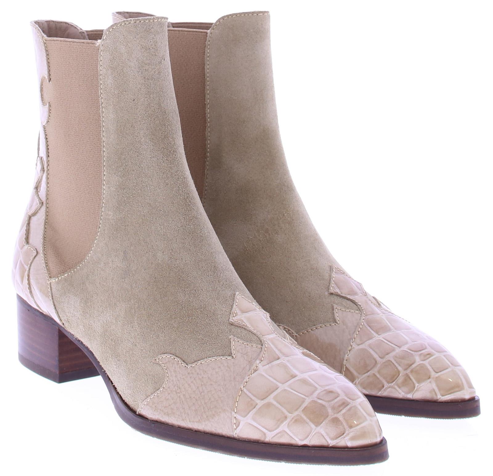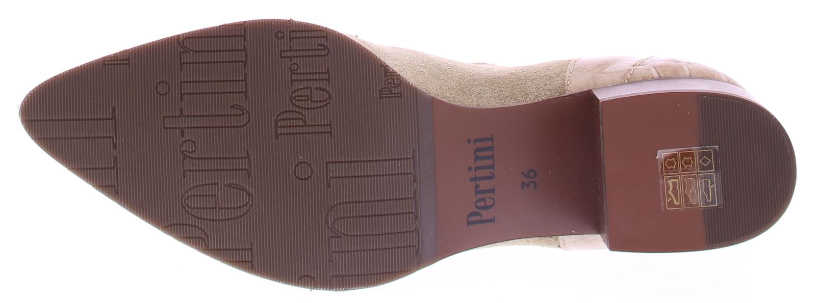 Beige suede dames laars van het merk Pertini. Deze enkellaars is uitgevoerd in suede met een voorkant van lakleer en heeft een crocoprint met vlam accenten. Dankzij de elastische zijpanelen trek je ’m gemakkelijk aan en uit en geeft het de laars een finishing touch! De voering is gemaakt van leer en heeft een vast voetbed. De hak heeft een hoogte van ruim 4 centimeter en de zool is afgewerkt met een rubber ribbeltjesprofiel voor voldoende grip.|