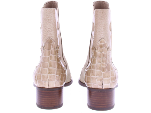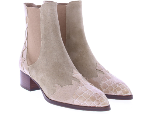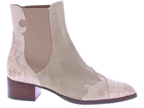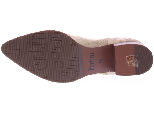 Beige suede dames laars van het merk Pertini. Deze enkellaars is uitgevoerd in suede met een voorkant van lakleer en heeft een crocoprint met vlam accenten. Dankzij de elastische zijpanelen trek je ’m gemakkelijk aan en uit en geeft het de laars een finishing touch! De voering is gemaakt van leer en heeft een vast voetbed. De hak heeft een hoogte van ruim 4 centimeter en de zool is afgewerkt met een rubber ribbeltjesprofiel voor voldoende grip.|