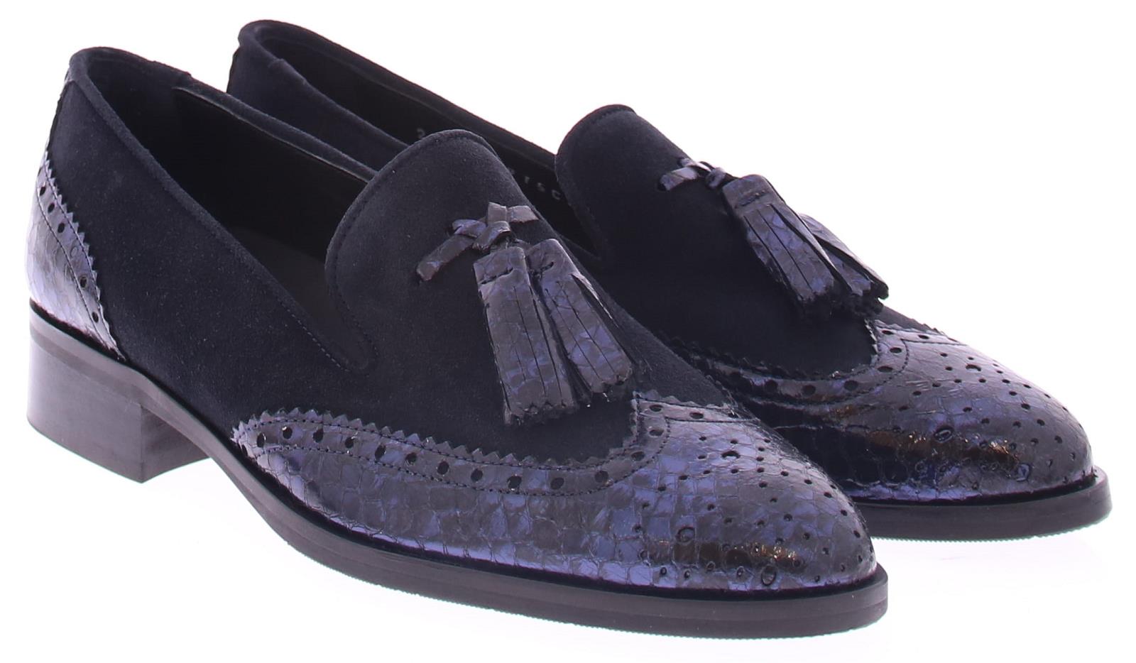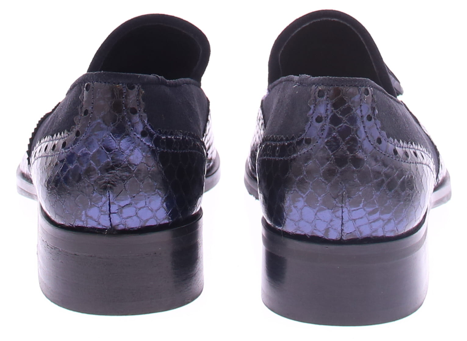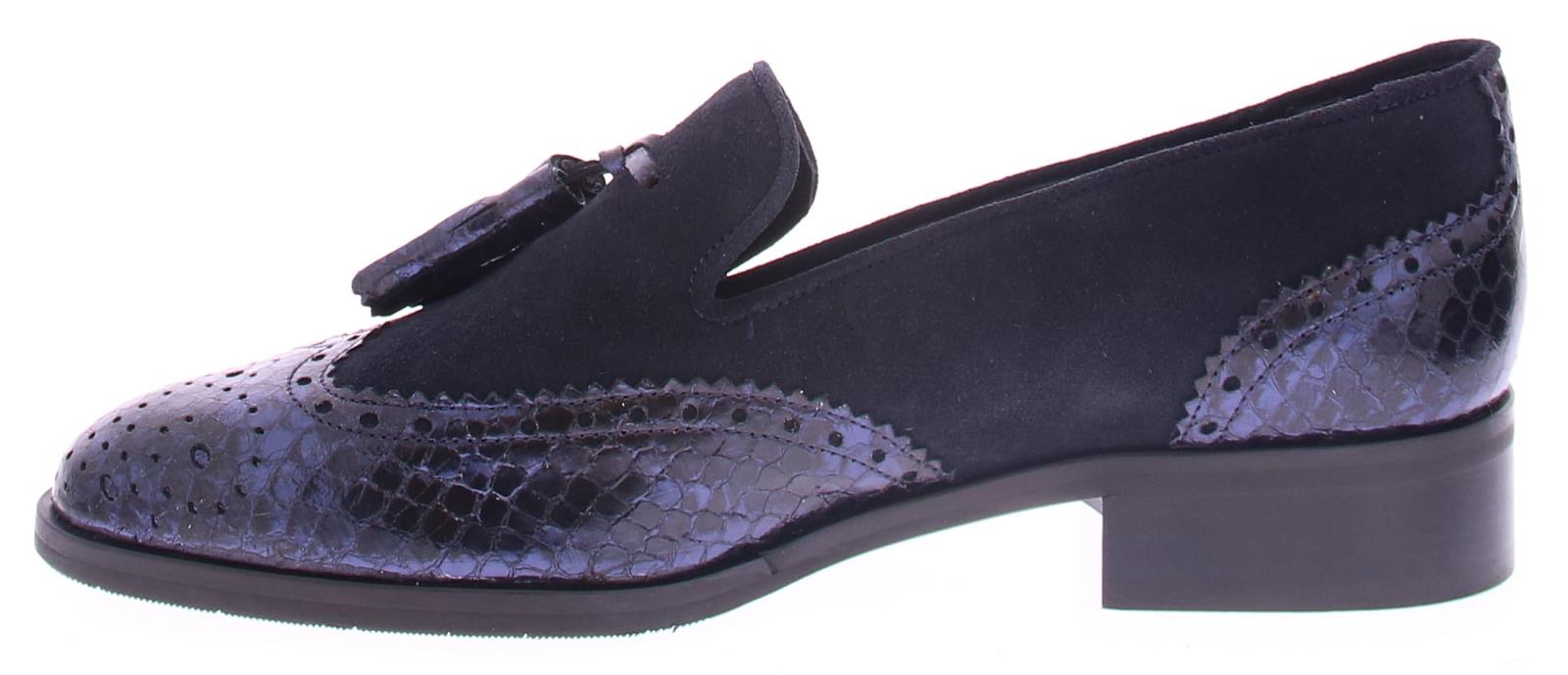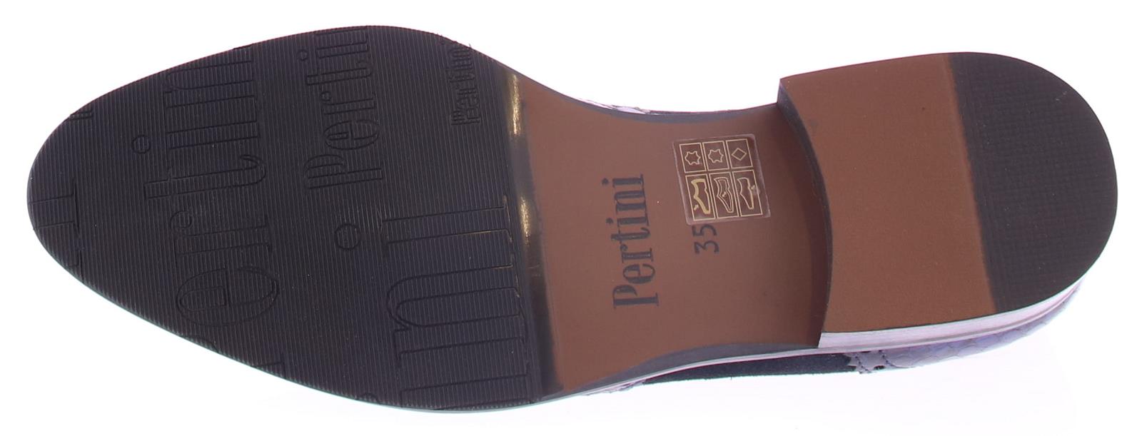 Donkerblauw suede dames instapper van het merk Pertini. Deze instapper is uitgevoerd in soepel suède en heeft een decoratieve brogue neus met passende perforaties. Leuk detail is de leren tassel bovenop de wreef. Het binnenwerk van de schoen is uitgevoerd in leer en heeft een vast voetbed. De leren zool heeft een rubberen afwerking en een gelaagde hak met een hoogte van zo'n 2 centimeter