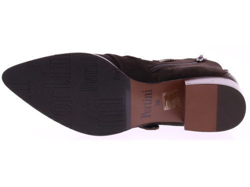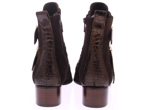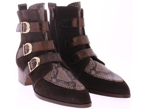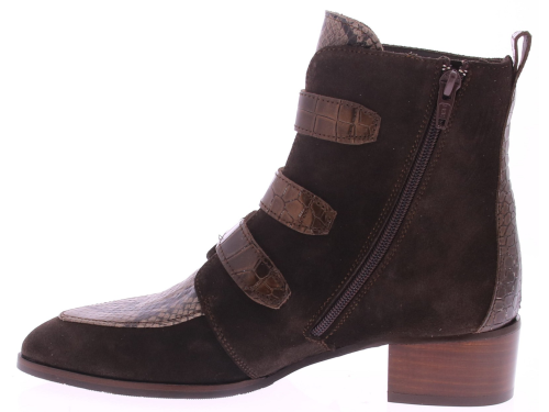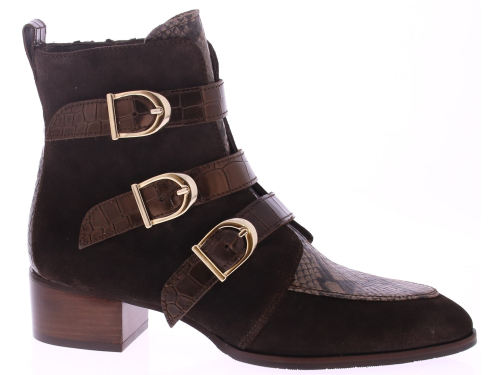 Donkerbruin suede dames korte laars van Pertini. Dit model heeft is een verfijnde combinatie van structuur en contrast. Terwijl drie smalle bandjes in bruin crocoprint leer – elk met een goudkleurig gespje – een stijlvol accent geven aan de enkel. Op de wreef is een subtiel stuk slangenprint leer verwerkt. De voering is van leer en het hakje van 4 cm geeft net genoeg hoogte zonder in te leveren op draaggemak. Een elegant laarsje met stoere details, perfect voor zowel casual als geklede looks.