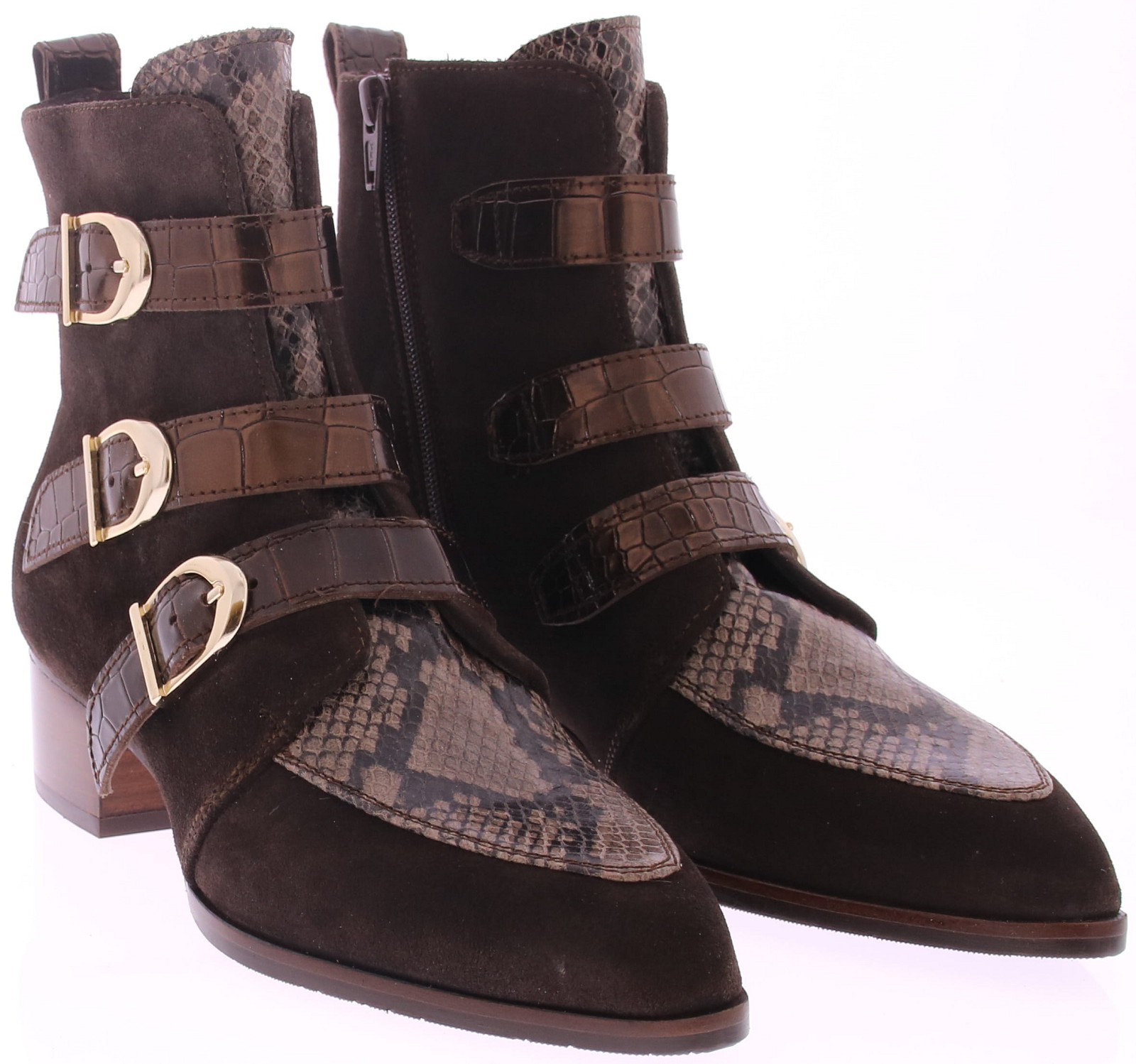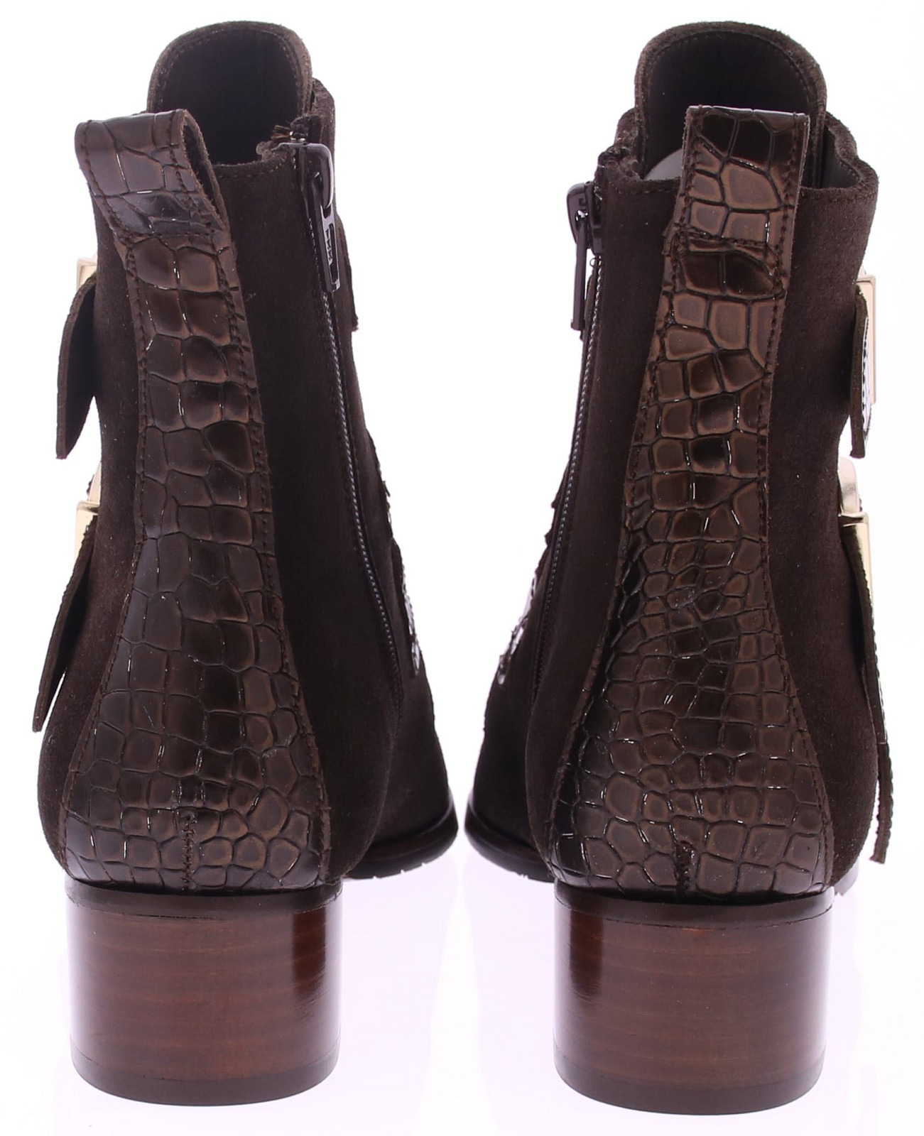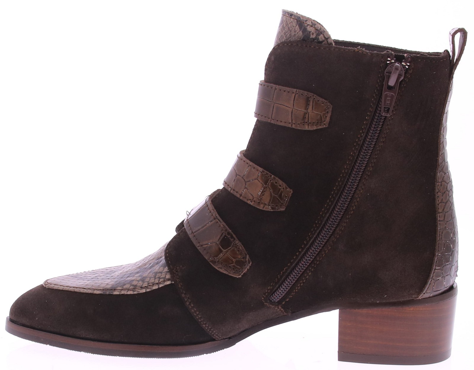 Donkerbruin suede dames korte laars van Pertini. Dit model heeft is een verfijnde combinatie van structuur en contrast. Terwijl drie smalle bandjes in bruin crocoprint leer – elk met een goudkleurig gespje – een stijlvol accent geven aan de enkel. Op de wreef is een subtiel stuk slangenprint leer verwerkt. De voering is van leer en het hakje van 4 cm geeft net genoeg hoogte zonder in te leveren op draaggemak. Een elegant laarsje met stoere details, perfect voor zowel casual als geklede looks.