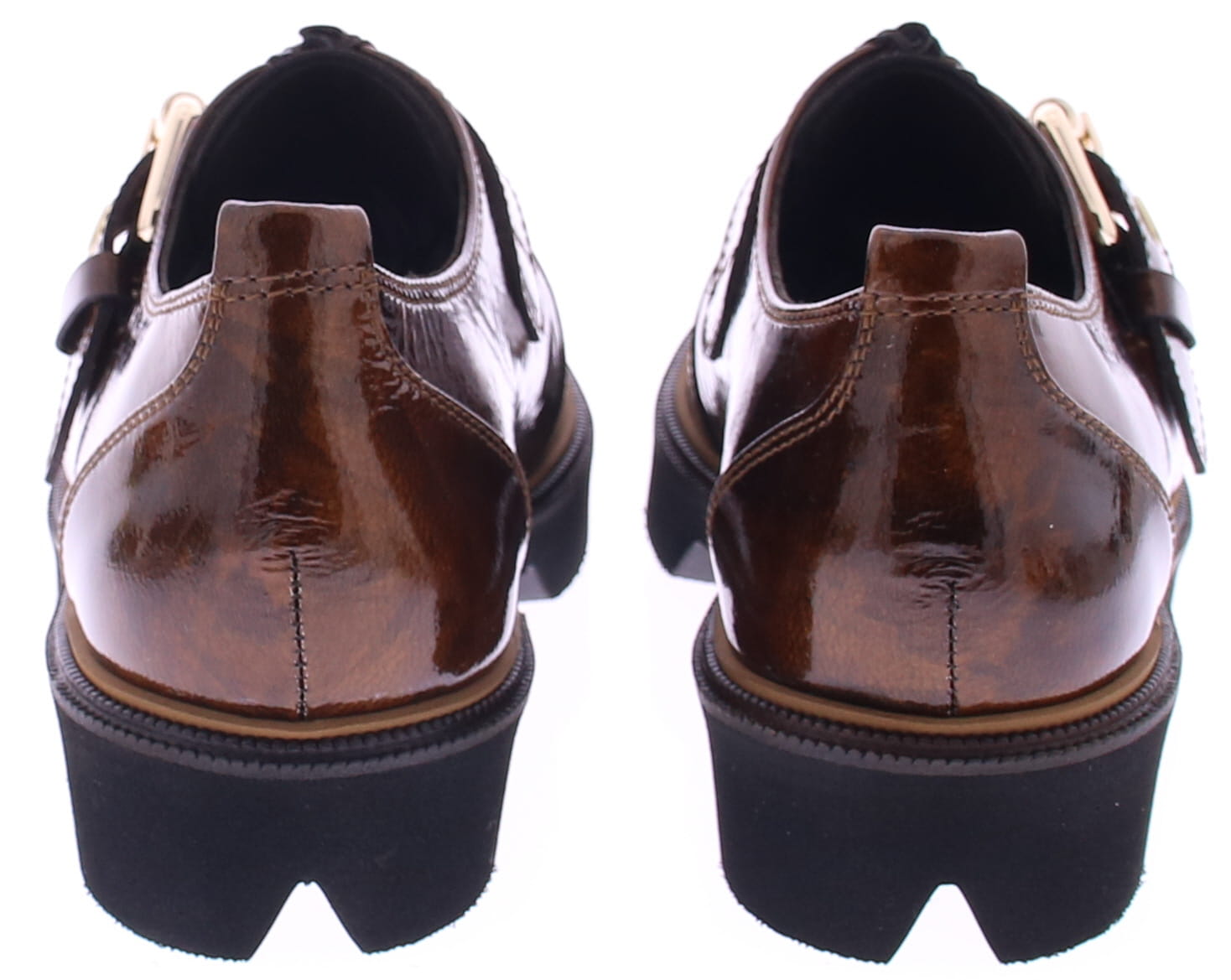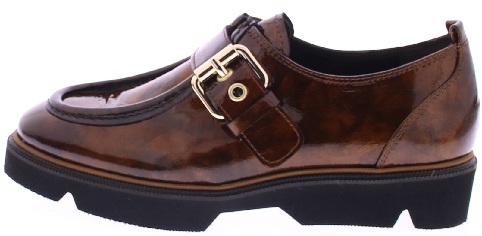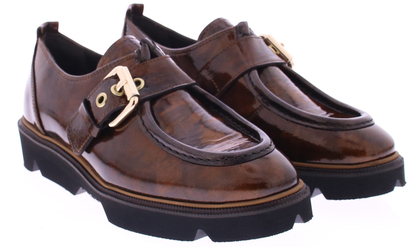 Bruin lakleren veterschoen voor dames van Pertini. Deze stijlvolle instapschoen van Pertini is uitgevoerd in glanzend bruin lakleer met een subtiele print. Dit model heeft een goudkleurige gesp als sluiting over de wreef – een chique detail dat de schoen net dat beetje extra karakter geeft. De grove rubberen zool zorgt voor een moderne, robuuste basis met veel draagcomfort. Een eigentijdse instapper die moeiteloos combineert met zowel een pantalon als een cropped jeans.