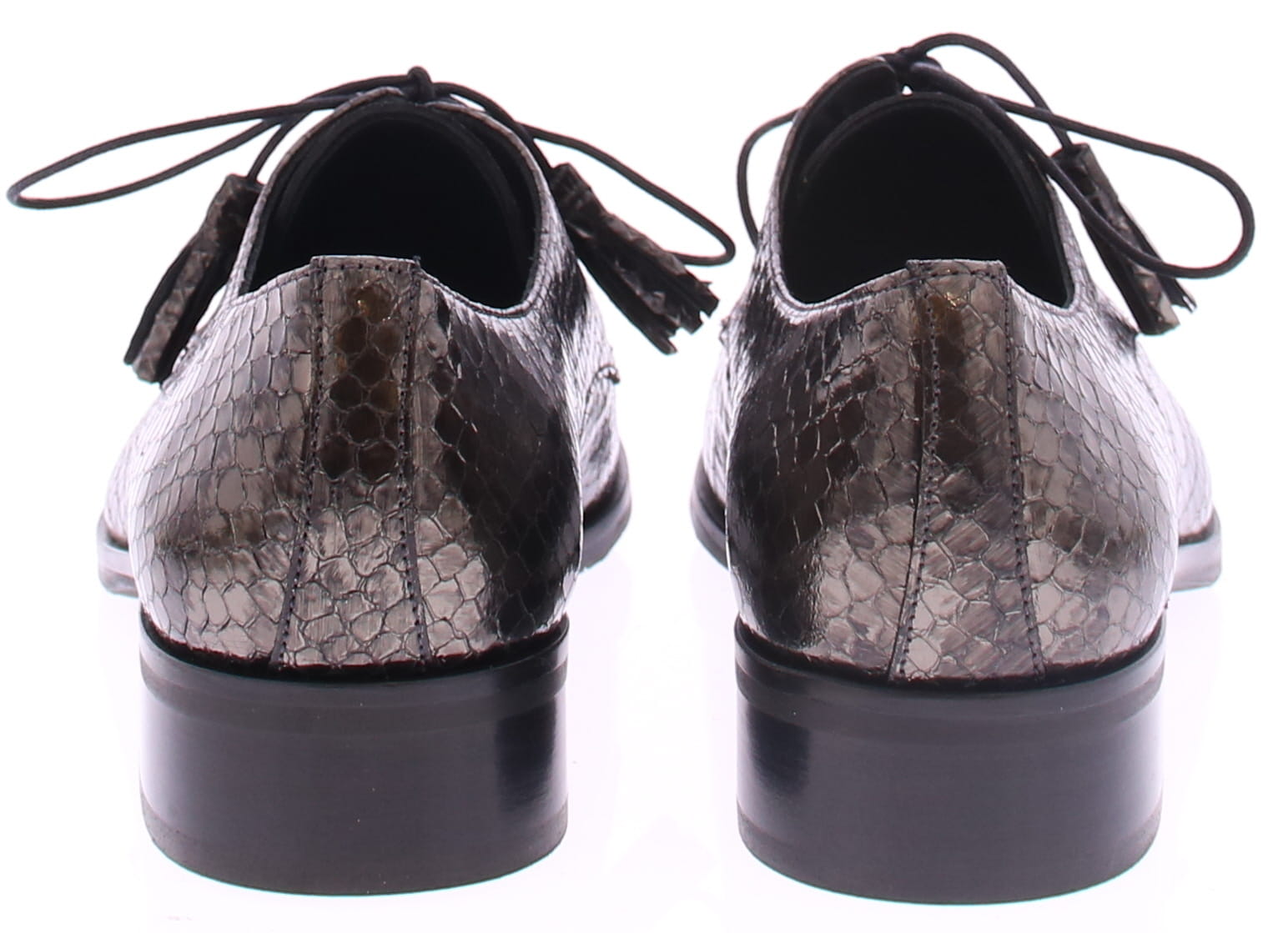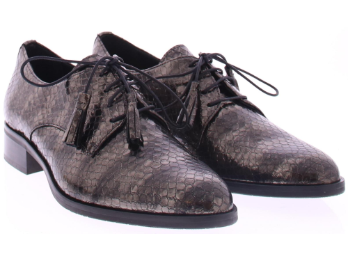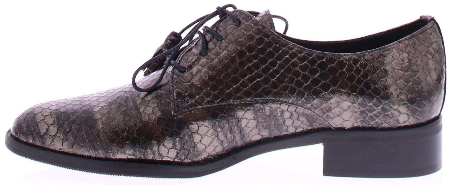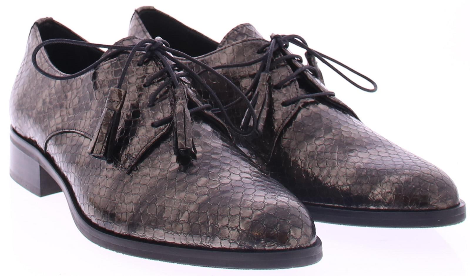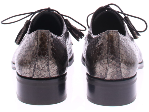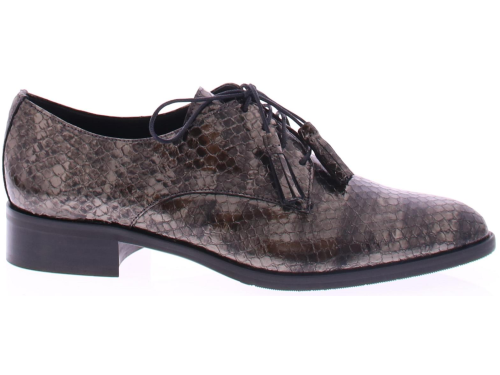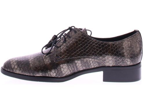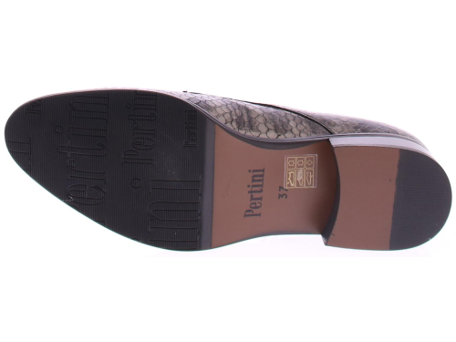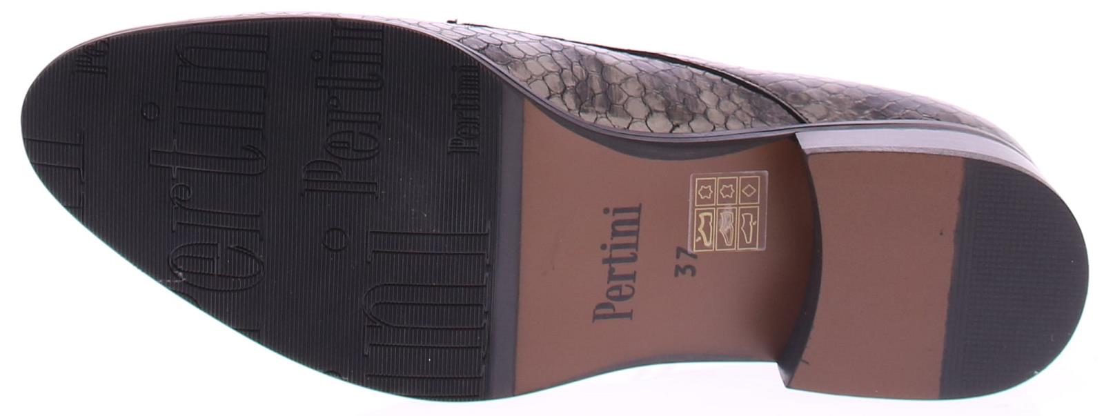 Bronskleurige slangen print met streep veterschoen van Pertini. De toevoeging van kwastjes aan de veters geeft de schoen een speels en verfijnd detail. Deze schoen is voorzien van een 2 cm blokhakje dat net genoeg hoogte biedt om je een elegante uitstraling te geven terwijl het toch gemakkelijk is om erop te lopen. De voering is van leer en de zool is rubber.