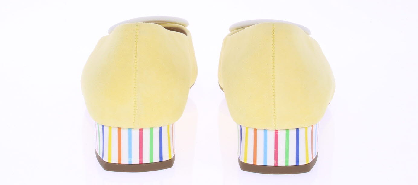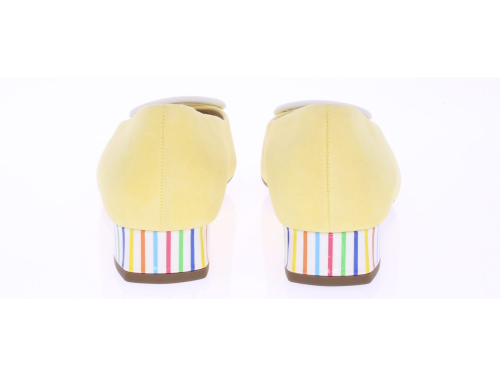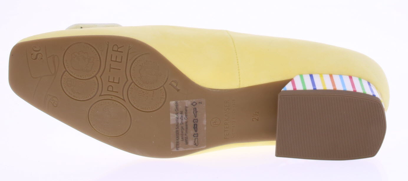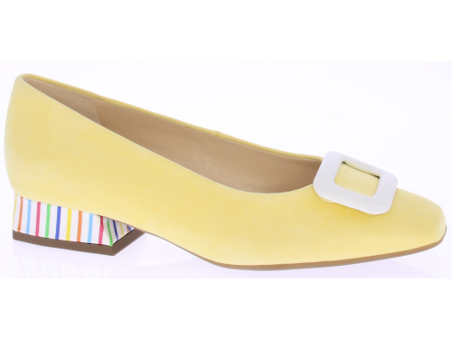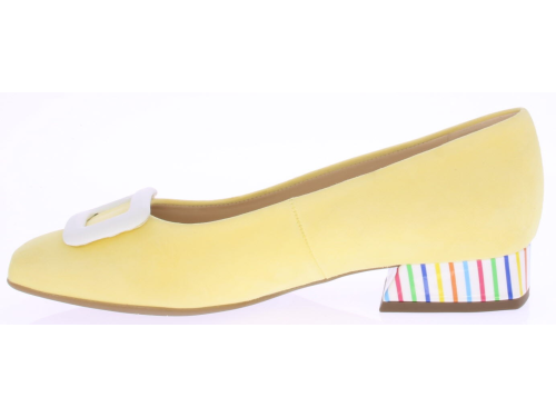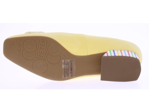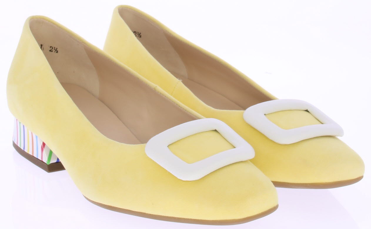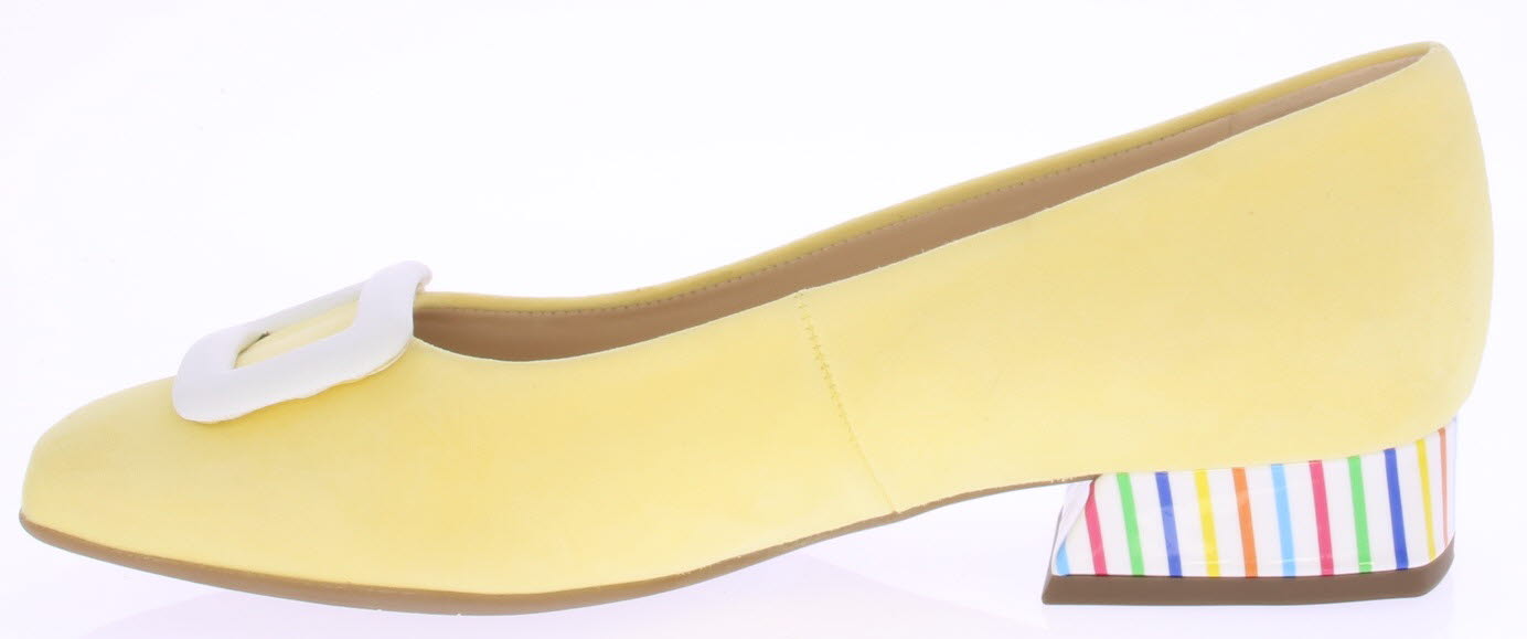 Licht geel suède dames pump van Peter Kaiser. De schoen is afgewerkt met een wit leren garnering op de voorvoet en een witte lakhak met multi streepjes. Omdat het een -plus- leest is valt hij wat breder.