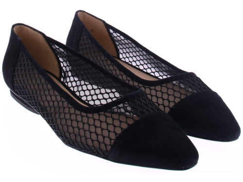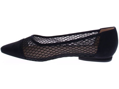 Zwart suède dames ballerina's van Peter Kaiser. Dit model heeft een opengewerkte mesh-stof die is tegengevoerd met fijn gaas. De spitse neus en het zachte suède zorgen voor een elegante uitstraling, terwijl de luchtige structuur bijzonder comfortabel draagt. Een moderne, verfijnde ballerina die moeiteloos combineert met zowel zakelijke outfits als chique gelegenheden. Ontdek ook de andere dames pumps van Peter Kaiser bij Klijsen.