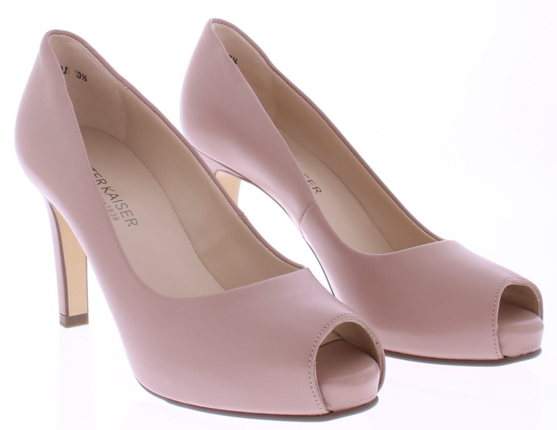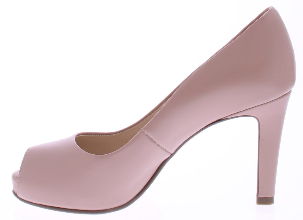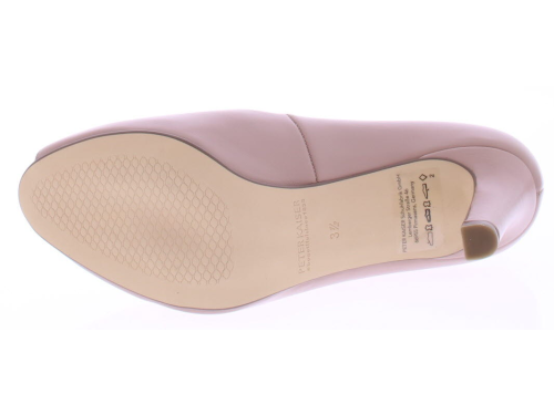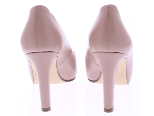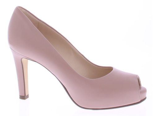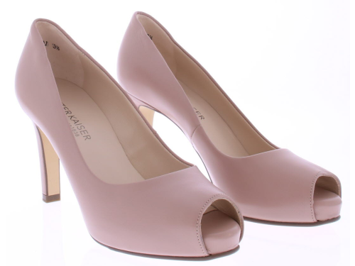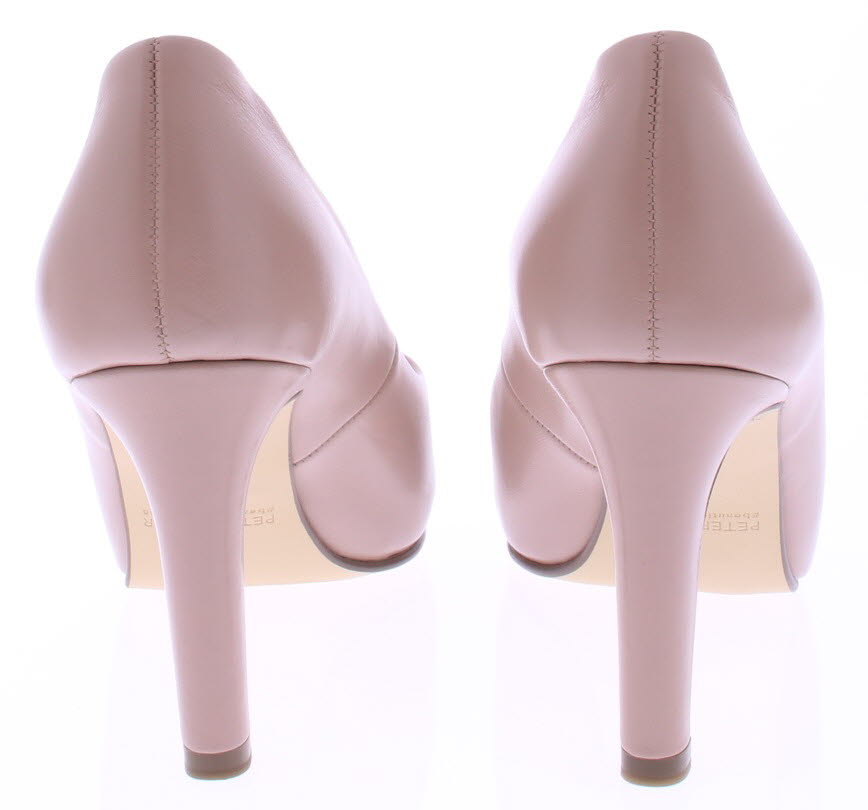 Nude leren peeptoe pump van Peter Kaiser. De pump heeft een onzichtbare plateauzool. De hak is 9.5 cm hoog maar voelt lager door de plateauzool.