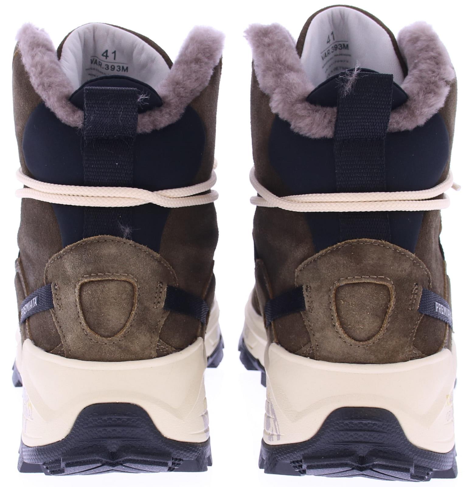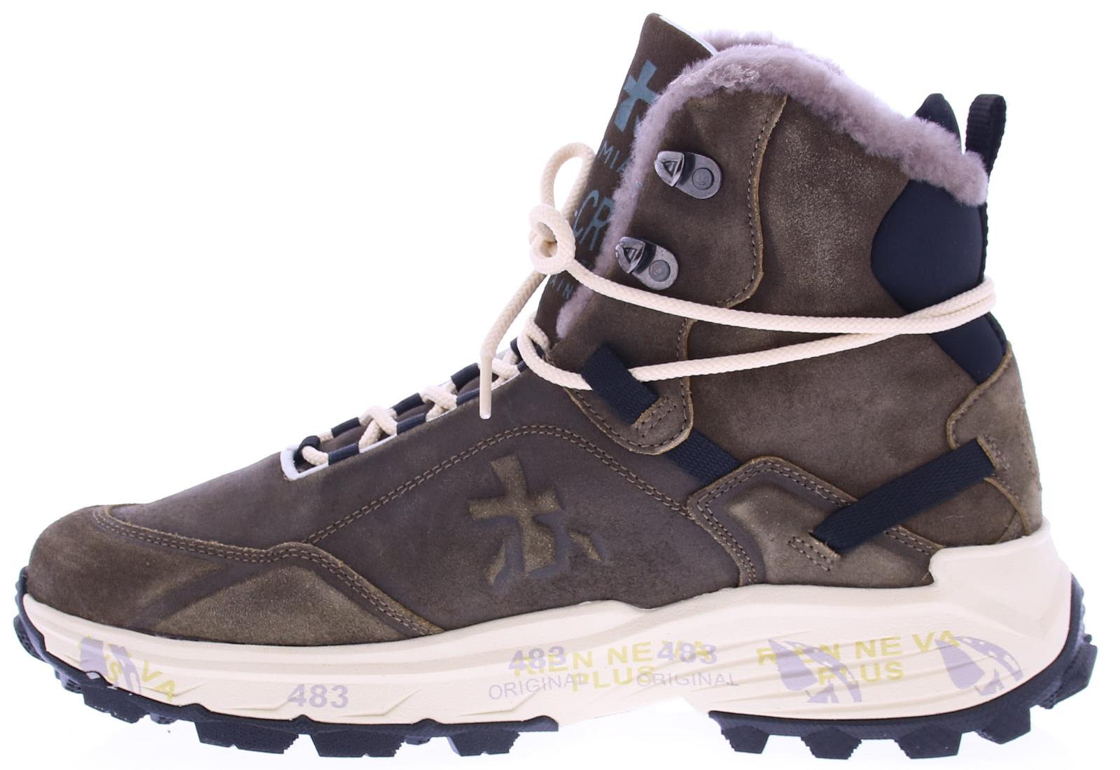 Khaki suède heren sneaker van Premiata. Deze sportieve hiking boot is van ge-olied suède en heeft een wollen voering. De super ergonomische, oplopende zool is uitzonderlijk licht van gewicht en heeft een goede grip door het ribbelprofiel in de loopzool. De diepe groeven in de loopzool zorgen voor een hoge flexibiliteit en daarmee een goede afwikkeling van de voet.