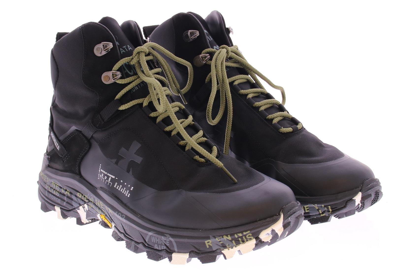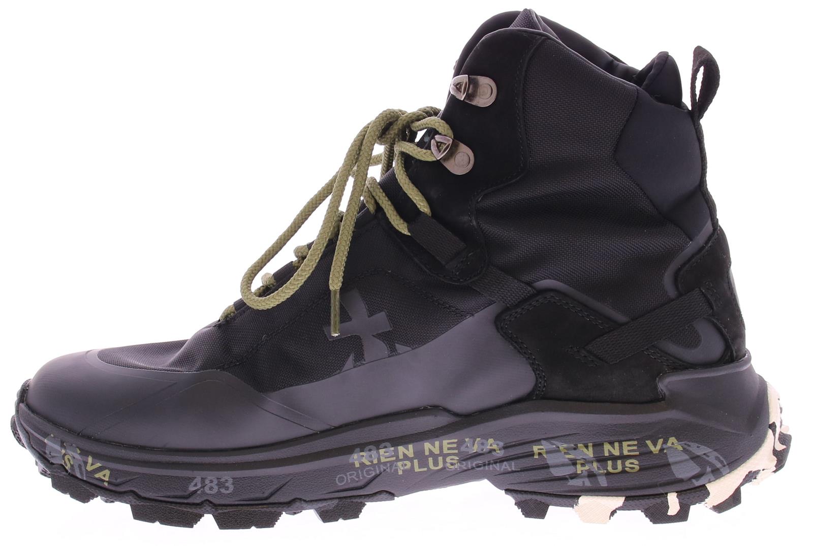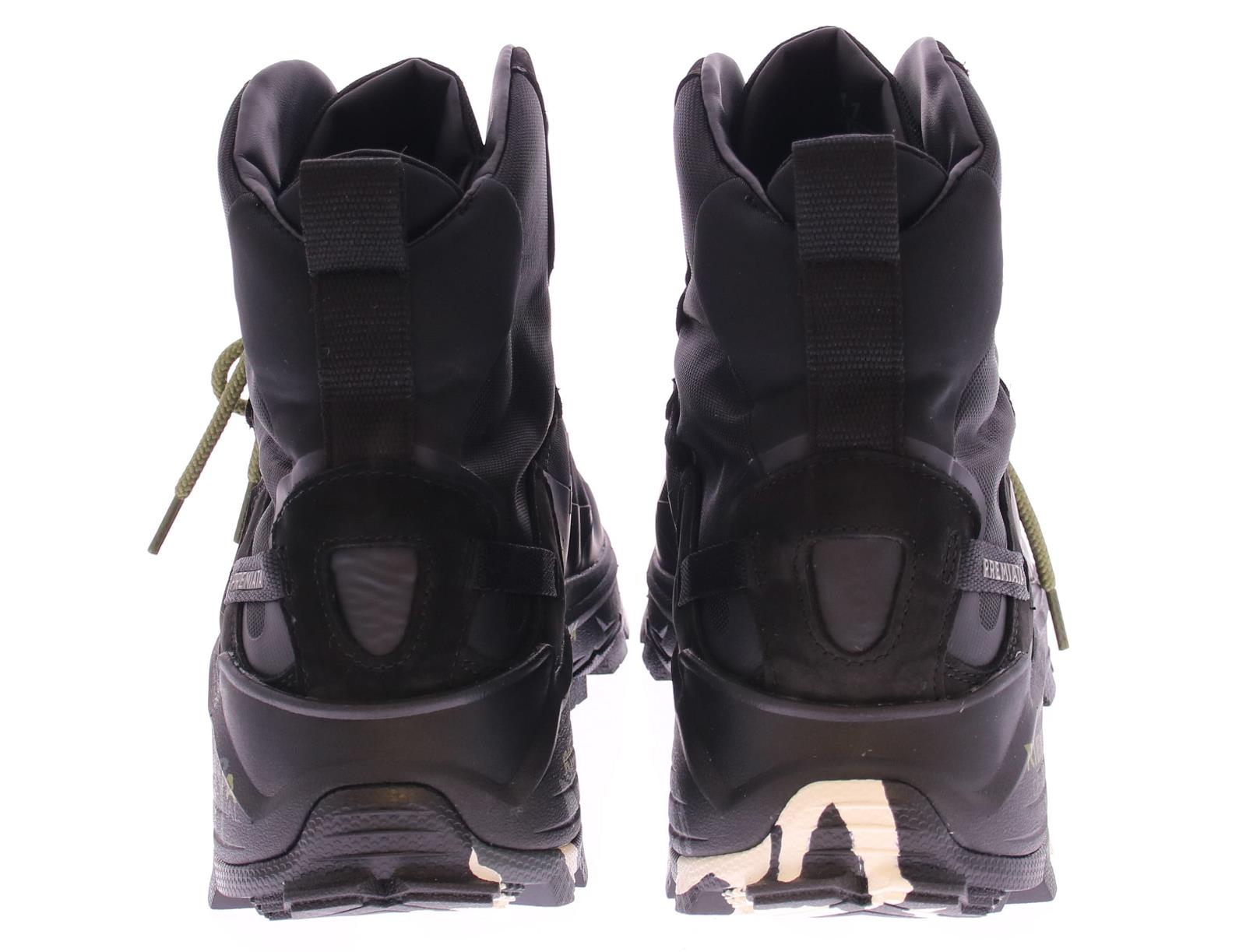 Zwarte heren sneaker van Premiata. Deze sportieve hiking boot heeft witte details op de zijkant en de zool. De super ergonomische, oplopende zool is uitzonderlijk licht van gewicht en heeft een goede grip door het ribbelprofiel in de loopzool. De diepe groeven in de loopzool zorgen voor een hoge flexibiliteit en daarmee een goede afwikkeling van de voet.