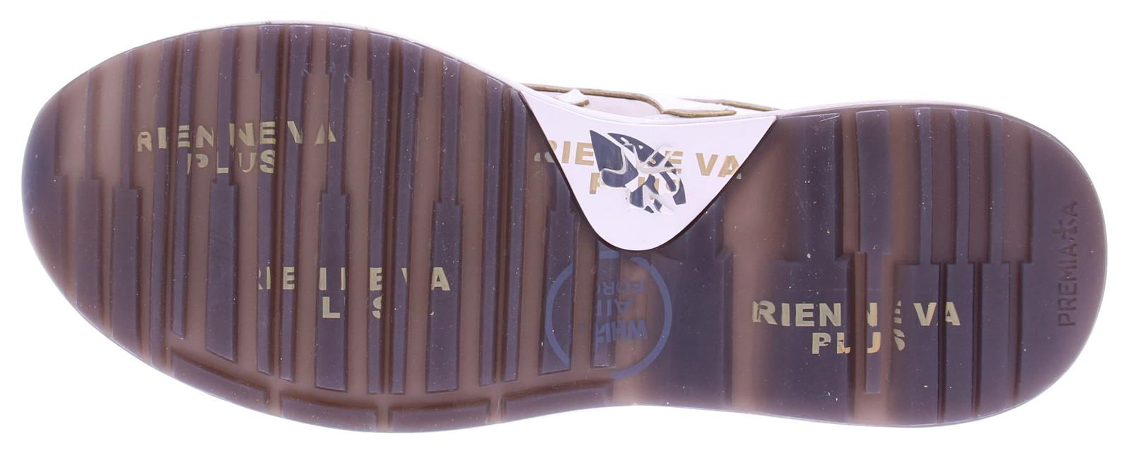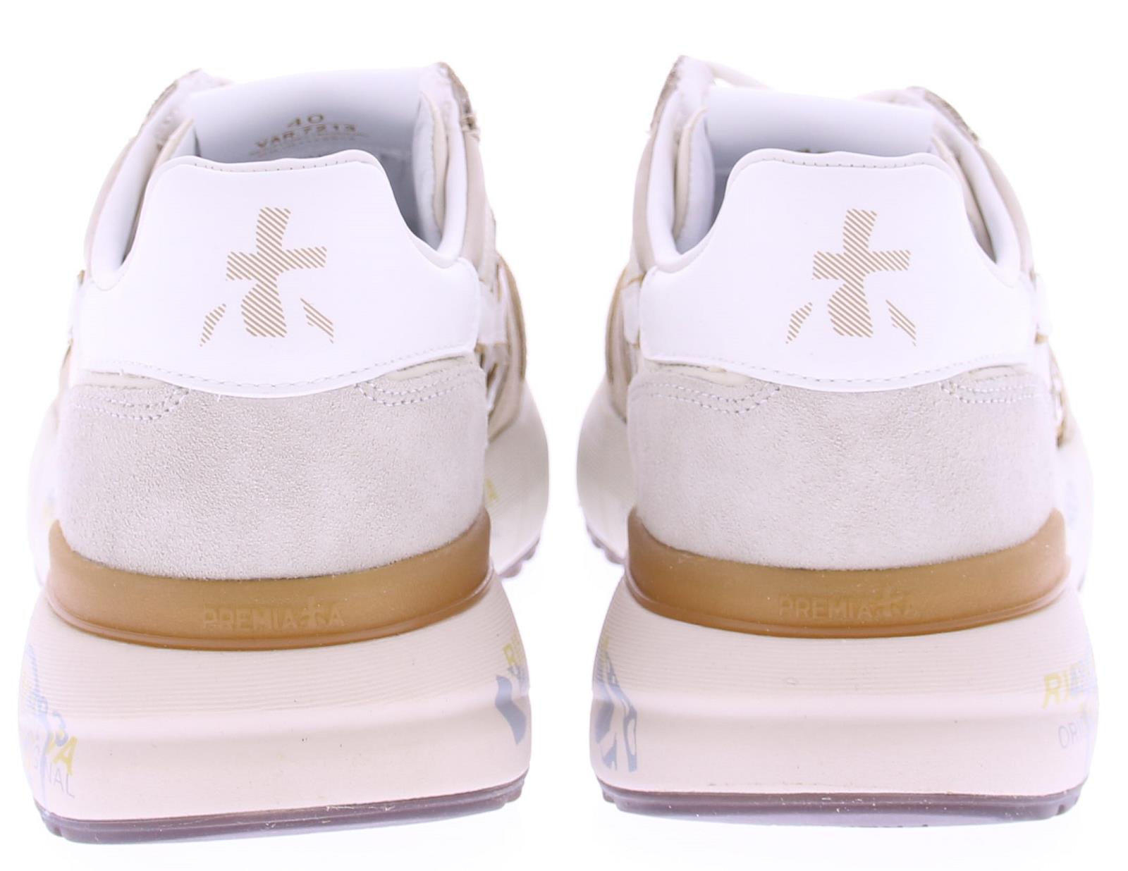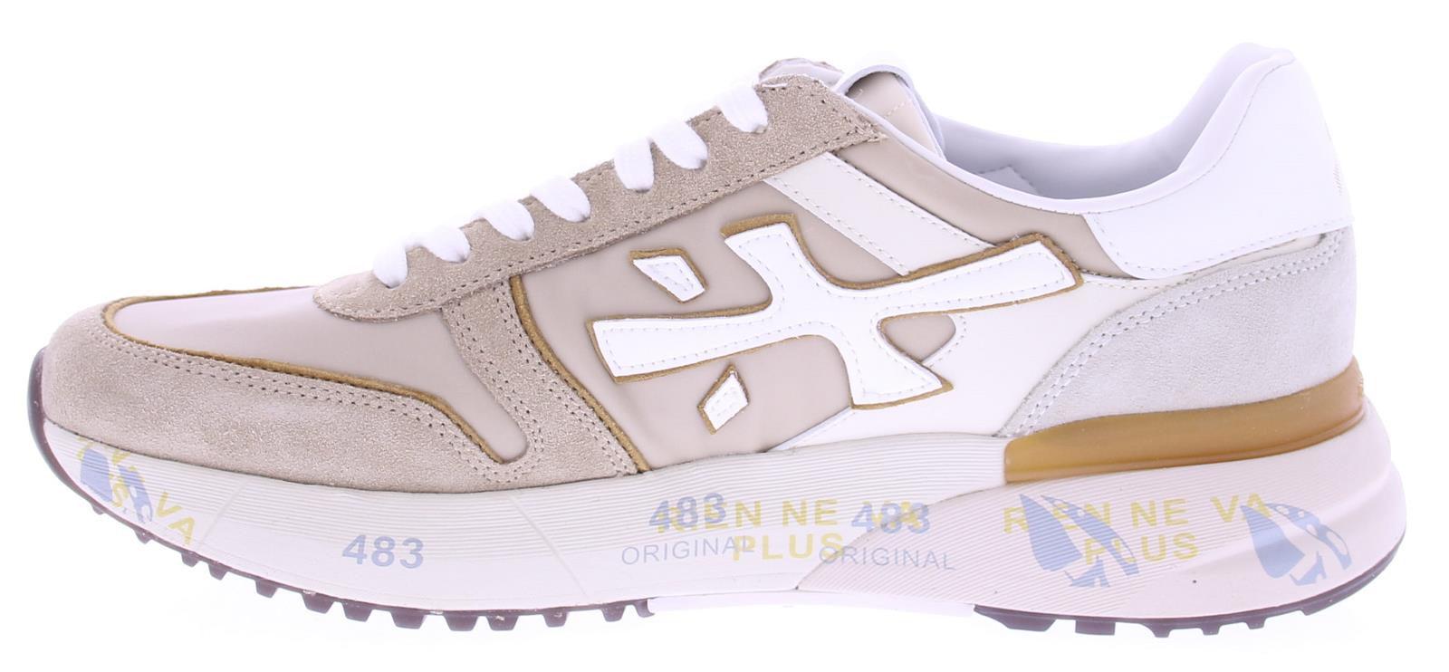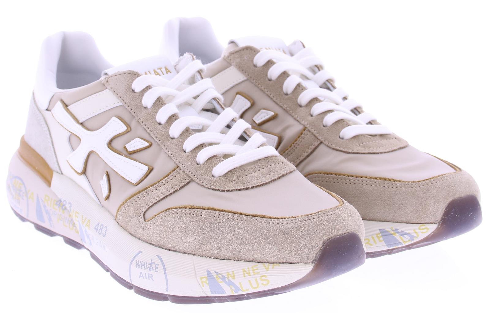 Heren sneaker van Premiata artikel Mick 7213. De schoen heeft een beige bovenwerk van suède met stof en heeft bruine accenten. De schoen heeft een creme kleurige tussenzool met rubber loopvlak. De voering is geheel van leer. En het voetbed is vervangbaar voor u eigen persoonlijke inlegzool.