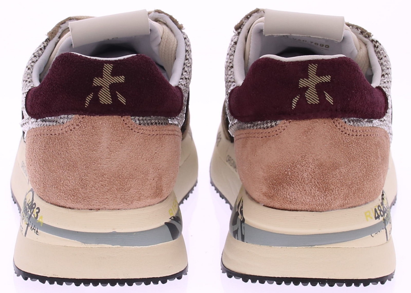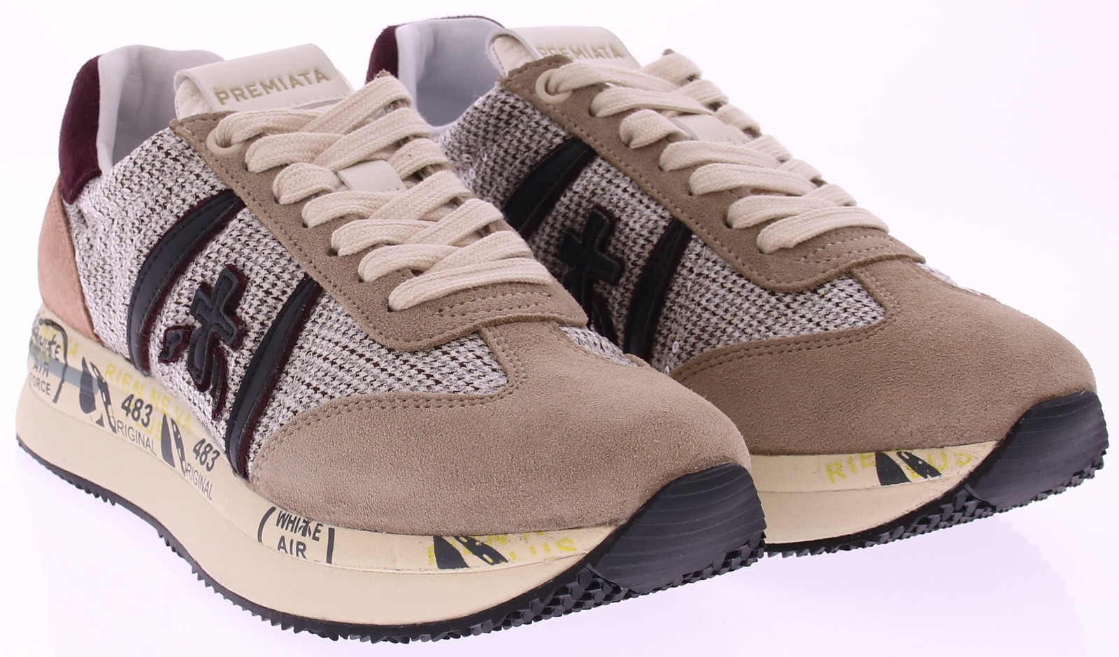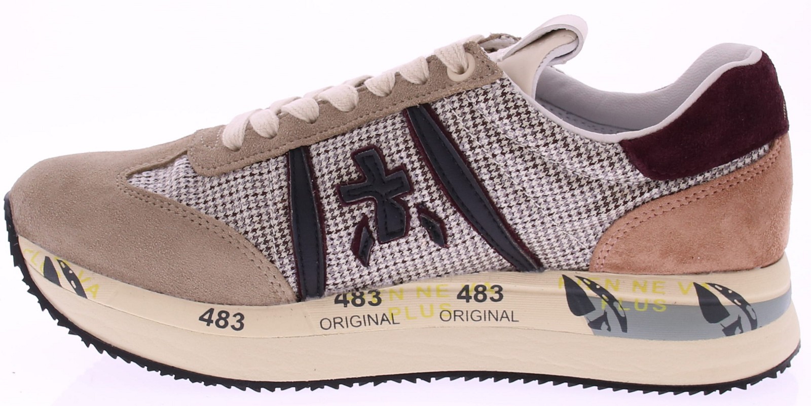 Beige stoffen met suede dames sneaker van Premiata met bordeaux, oud roze en zwarte accenten. De schoen is geheel leer gevoerd en heeft een uitneembaar voetbed. De herkenbare Premiata zool is voorzien van de iconische Premiata tekst en maakt de sneaker meteen herkenbaar, en biedt uitstekende demping en comfort. De fantastische pasvorm zorgt ervoor dat de schoen perfect aansluit en ideaal is voor langdurig dragen. Daarnaast heeft de sneaker een uitneembare zool, wat zorgt voor extra flexibiliteit en gemak. Een perfecte combinatie van stijl, comfort en kwaliteit die je van Premiata mag verwachten.