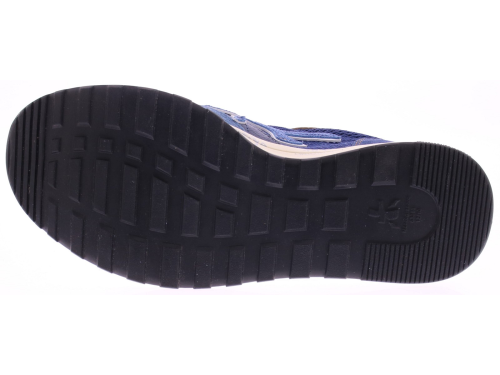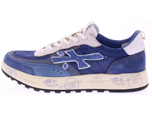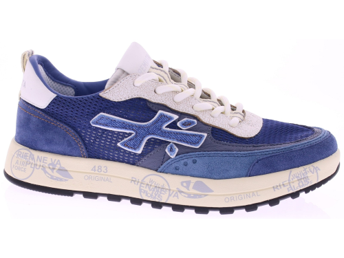 Blauw suède heren sneaker van Premiata. Dit model NOUS 8067 combineert diepblauwe tinten met witte en lichtgrijze accenten voor een frisse, eigentijdse uitstraling. De mix van suède en open mesh zorgt voor een ademend en luxe geheel, terwijl de kenmerkende zool met grafische details het sportieve karakter benadrukt. Het uitneembare voetbed biedt extra comfort en maakt deze sneaker geschikt voor eigen inlegzolen. Een modieuze keuze voor de man die casual stijl en kwaliteit waardeert.