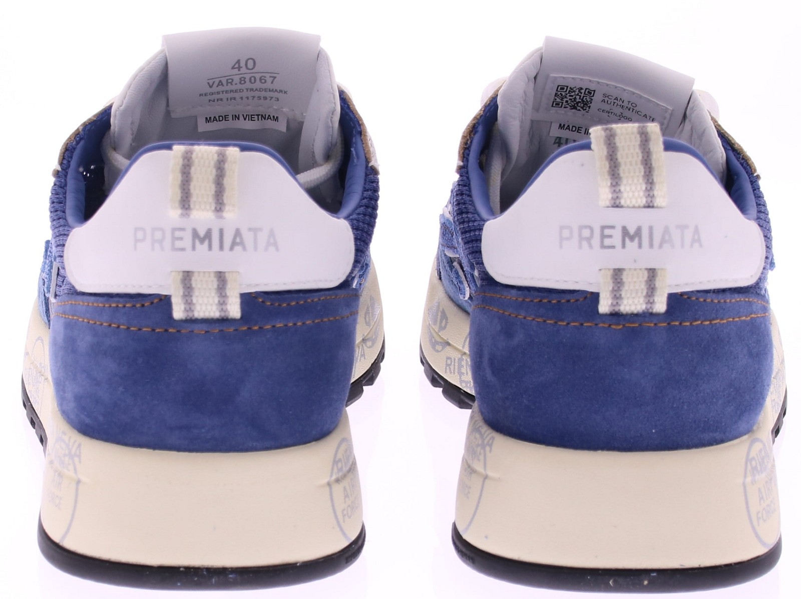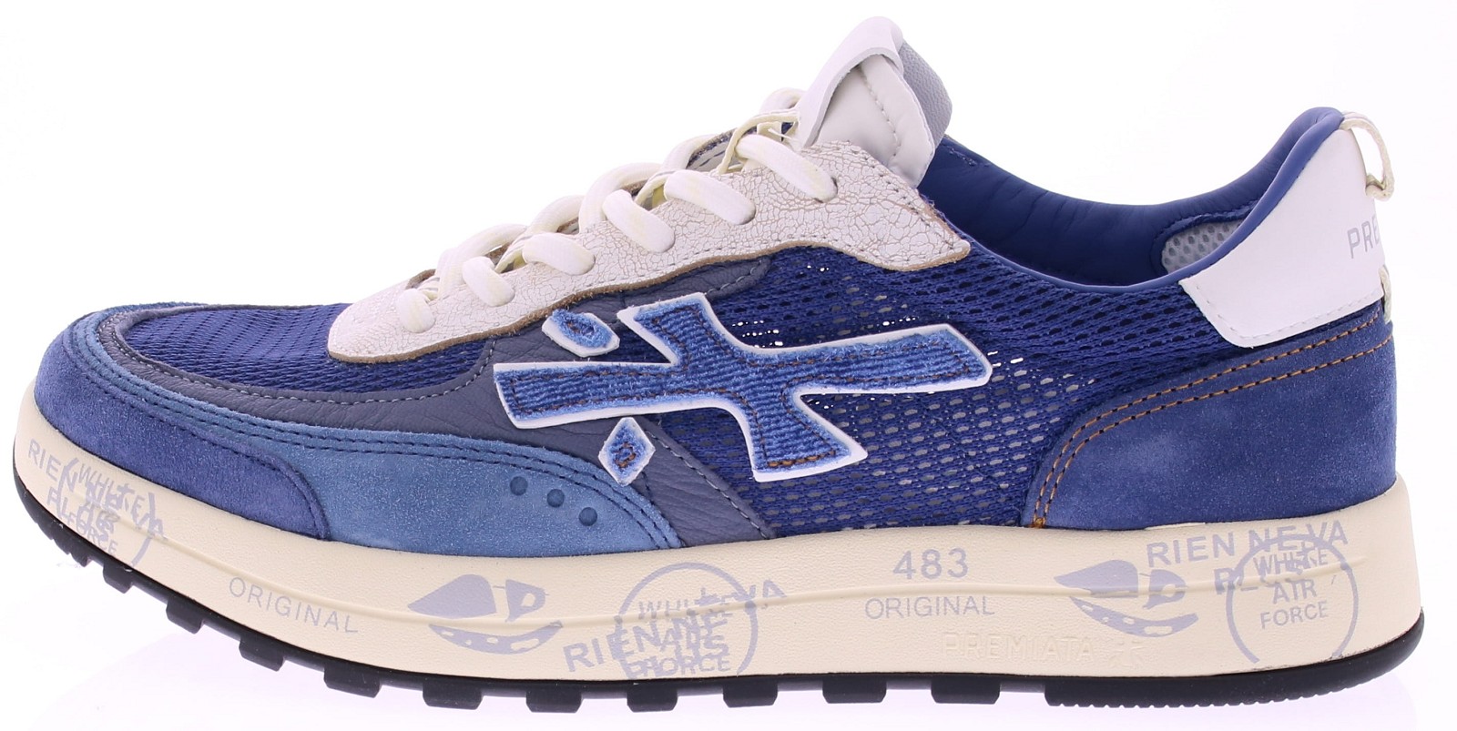 Blauw suède heren sneaker van Premiata. Dit model NOUS 8067 combineert diepblauwe tinten met witte en lichtgrijze accenten voor een frisse, eigentijdse uitstraling. De mix van suède en open mesh zorgt voor een ademend en luxe geheel, terwijl de kenmerkende zool met grafische details het sportieve karakter benadrukt. Het uitneembare voetbed biedt extra comfort en maakt deze sneaker geschikt voor eigen inlegzolen. Een modieuze keuze voor de man die casual stijl en kwaliteit waardeert.