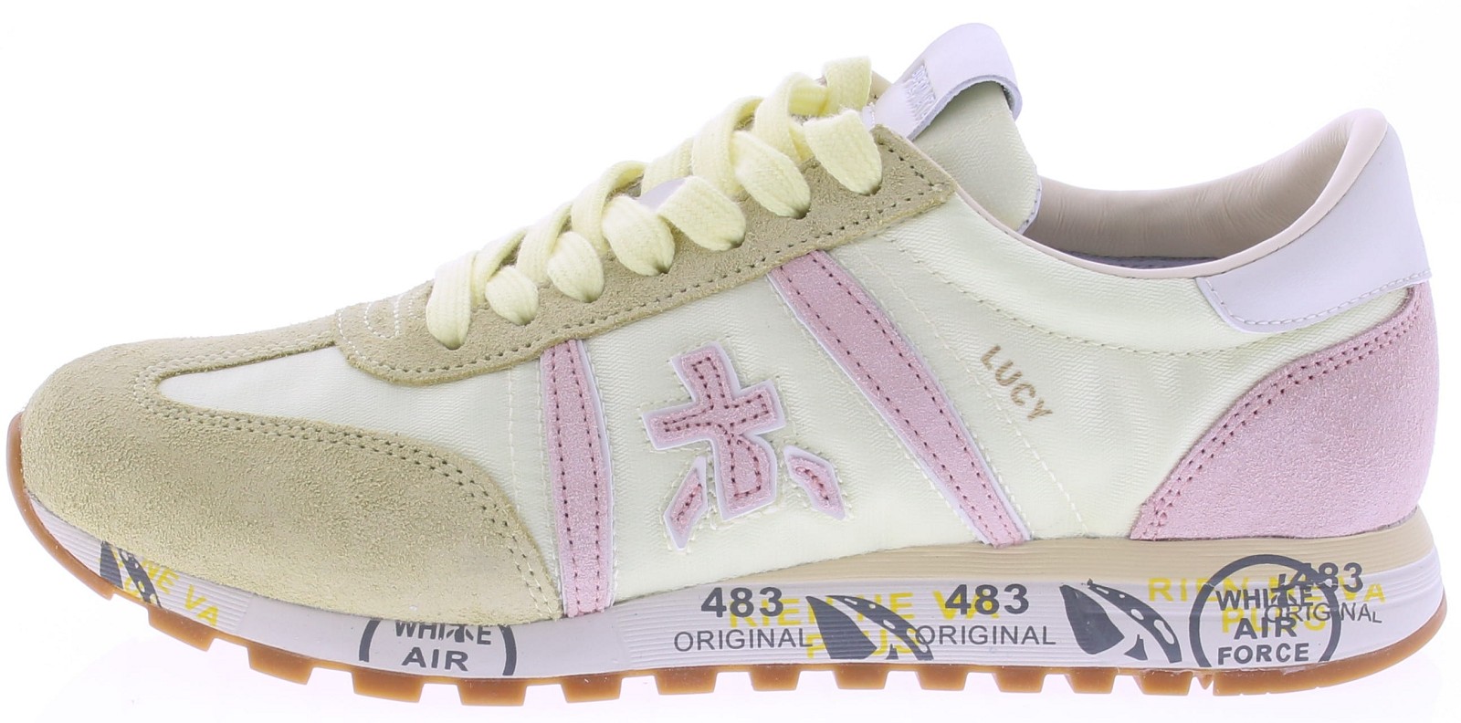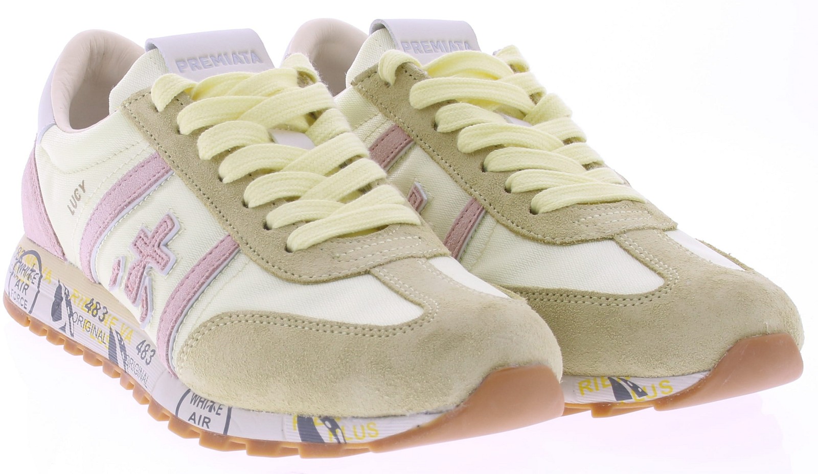 Geel stof met suede dames sneakers van Premiata, model Lucyd 8141. Deze sportieve sneaker combineert zachtgeel textiel met suède details en roze accenten. Het retro running silhouet sluit moeiteloos aan bij het moderne straatbeeld, terwijl de karakteristieke Premiata-zool zorgt voor comfort en herkenbare stijl. De zool is uitneembaar voor je eigen persoonlijke inlegzool. Perfect te dragen bij een lichte jeans of een casual voorjaarslook. Ontdek ook de andere dames sneakers van Premiata bij Klijsen.