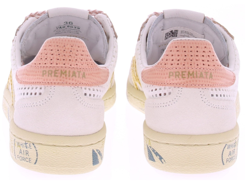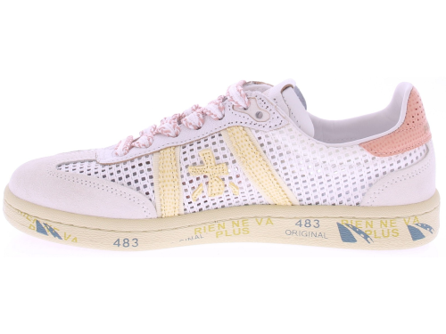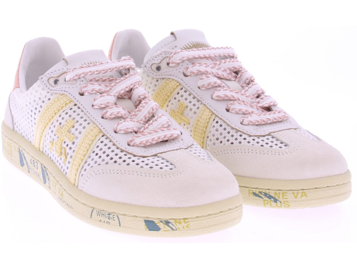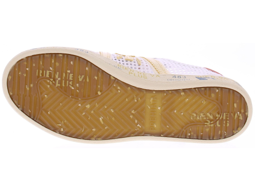 Wit leren dames sneakers van Premiata, model Bonnied 8039. Deze zomerse sneaker is uitgevoerd in geperforeerd leer met zachte suède details en frisse gele accenten voor een lichte, luchtige uitstraling. Het opengewerkte design zorgt voor extra ventilatie, terwijl de herkenbare Premiata-zool met “White Air” technologie comfortabel ondersteunt bij elke stap. Het voetbed is uitneembaar voor je eigen persoonlijke inlegzool. Perfect te combineren met een luchtige broek of een casual zomerlook. Ontdek ook de andere dames sneakers van Premiata bij Klijsen.