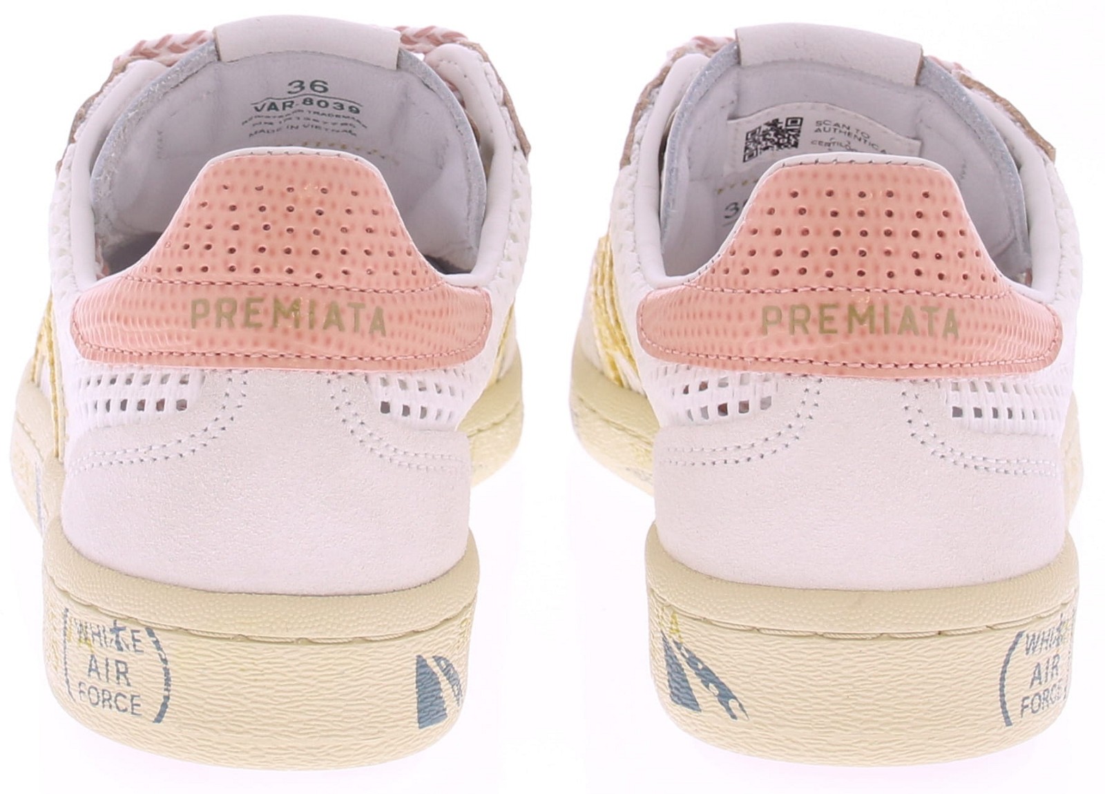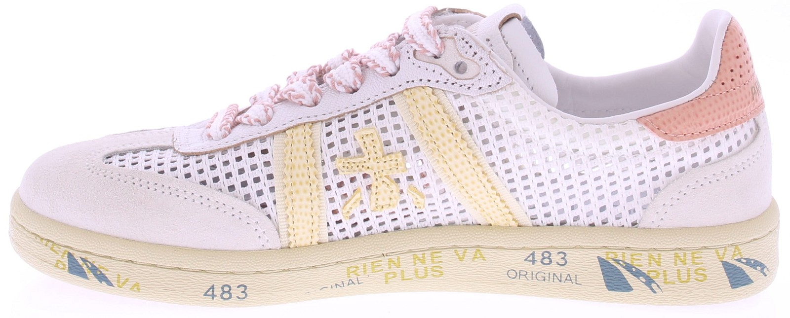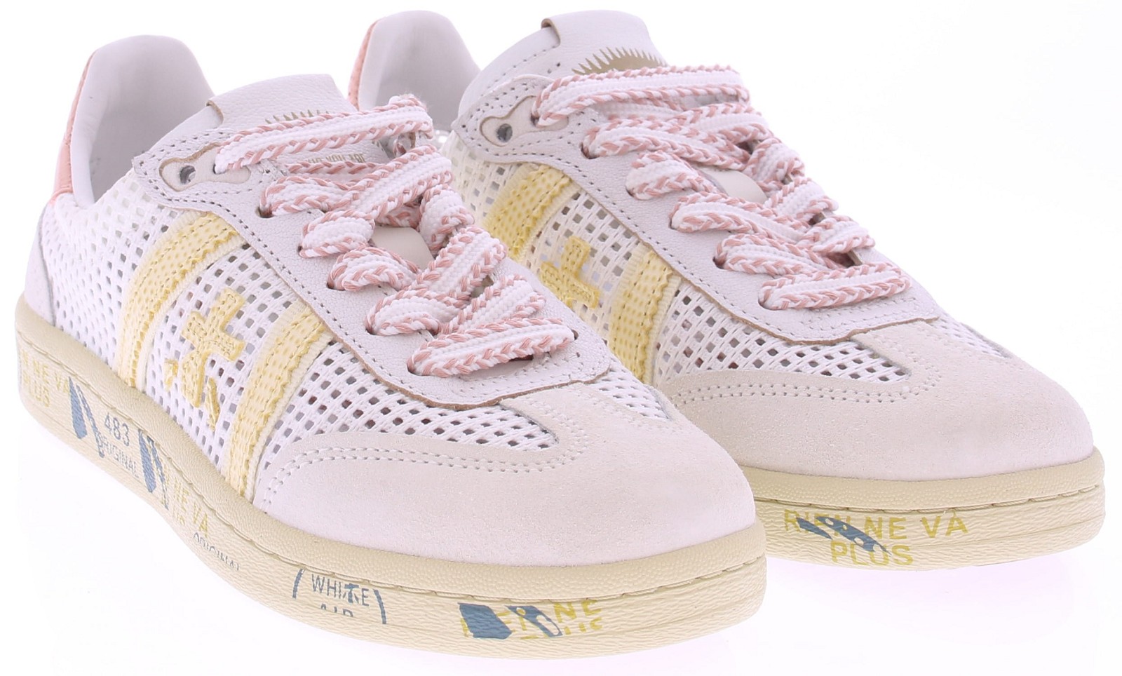 Wit leren dames sneakers van Premiata, model Bonnied 8039. Deze zomerse sneaker is uitgevoerd in geperforeerd leer met zachte suède details en frisse gele accenten voor een lichte, luchtige uitstraling. Het opengewerkte design zorgt voor extra ventilatie, terwijl de herkenbare Premiata-zool met “White Air” technologie comfortabel ondersteunt bij elke stap. Het voetbed is uitneembaar voor je eigen persoonlijke inlegzool. Perfect te combineren met een luchtige broek of een casual zomerlook. Ontdek ook de andere dames sneakers van Premiata bij Klijsen.