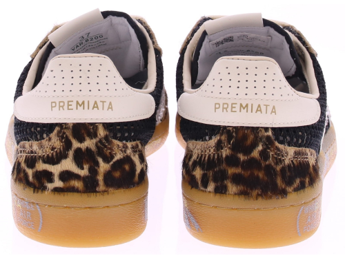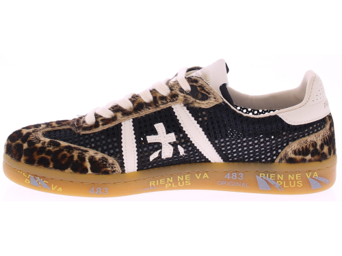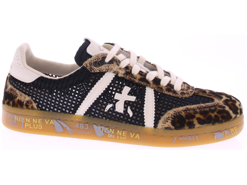 Zwart met panterprint dames sneakers van Premiata, model Bonnied 8200. Deze opvallende sneaker combineert geperforeerd leer met zachte suède en harige panterprintdetails voor een modieuze look. Het witte Premiata-logo en de herkenbare “White Air” zool zorgen voor een frisse, sportieve balans. Het voetbed is uitneembaar voor je eigen persoonlijke inlegzool, waardoor comfort en gemak perfect samengaan. Ideaal te dragen met een stoere jeans of een casual outfit. Ontdek ook de andere dames sneakers van Premiata bij Klijsen.
