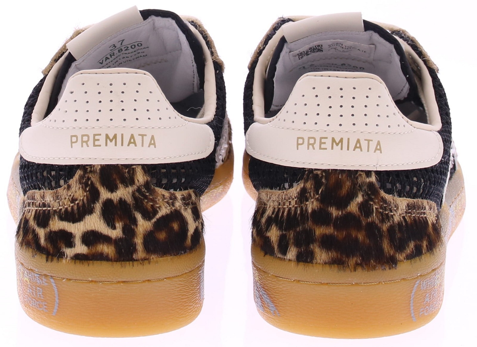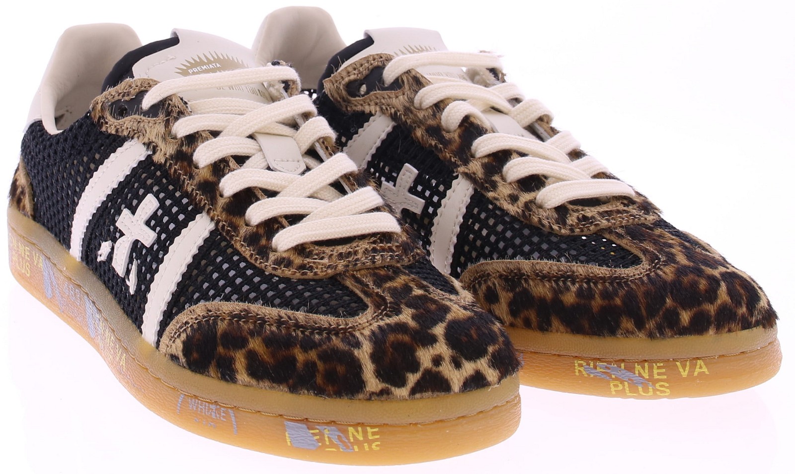 Zwart met panterprint dames sneakers van Premiata, model Bonnied 8200. Deze opvallende sneaker combineert geperforeerd leer met zachte suède en harige panterprintdetails voor een modieuze look. Het witte Premiata-logo en de herkenbare “White Air” zool zorgen voor een frisse, sportieve balans. Het voetbed is uitneembaar voor je eigen persoonlijke inlegzool, waardoor comfort en gemak perfect samengaan. Ideaal te dragen met een stoere jeans of een casual outfit. Ontdek ook de andere dames sneakers van Premiata bij Klijsen.