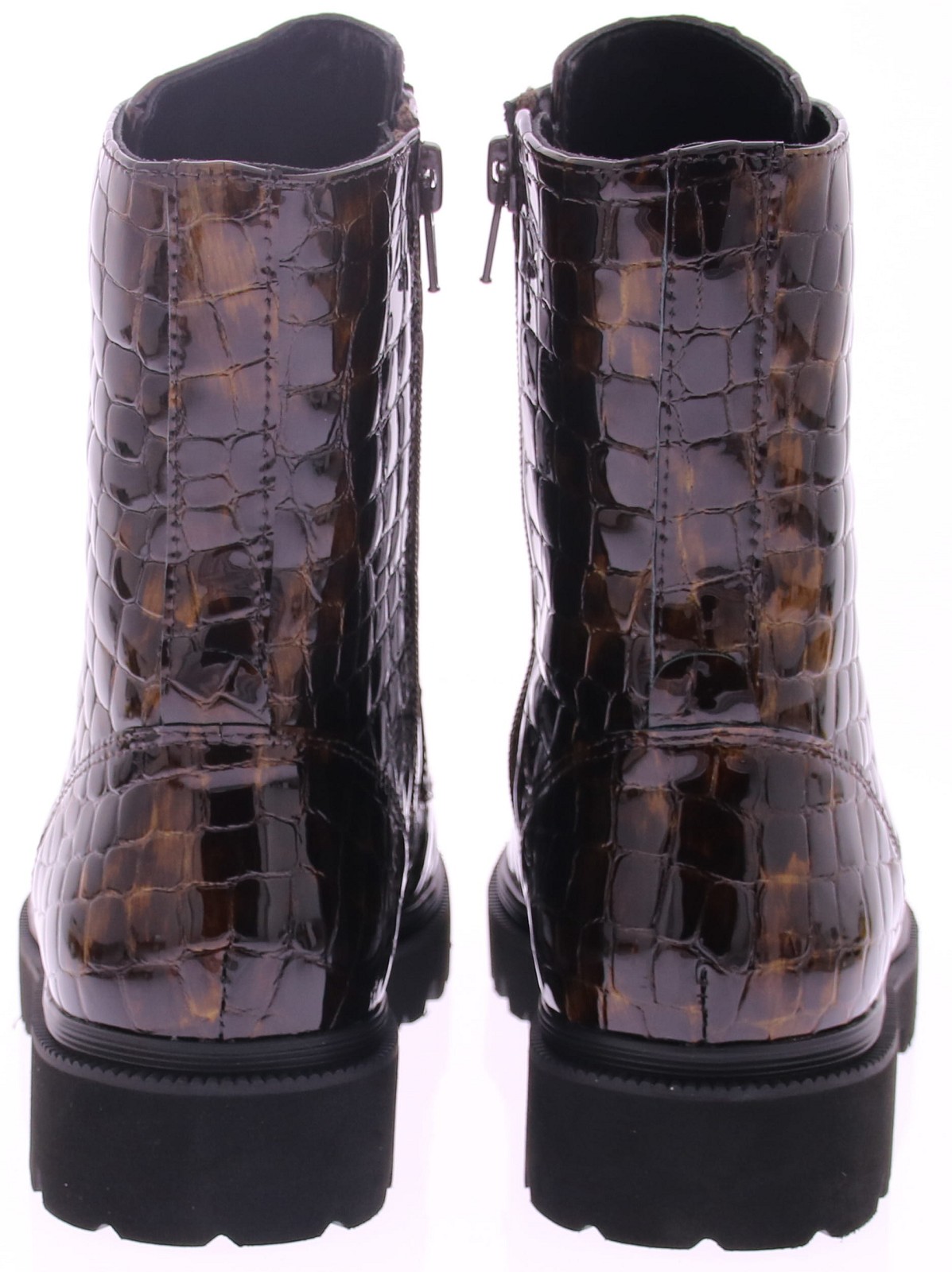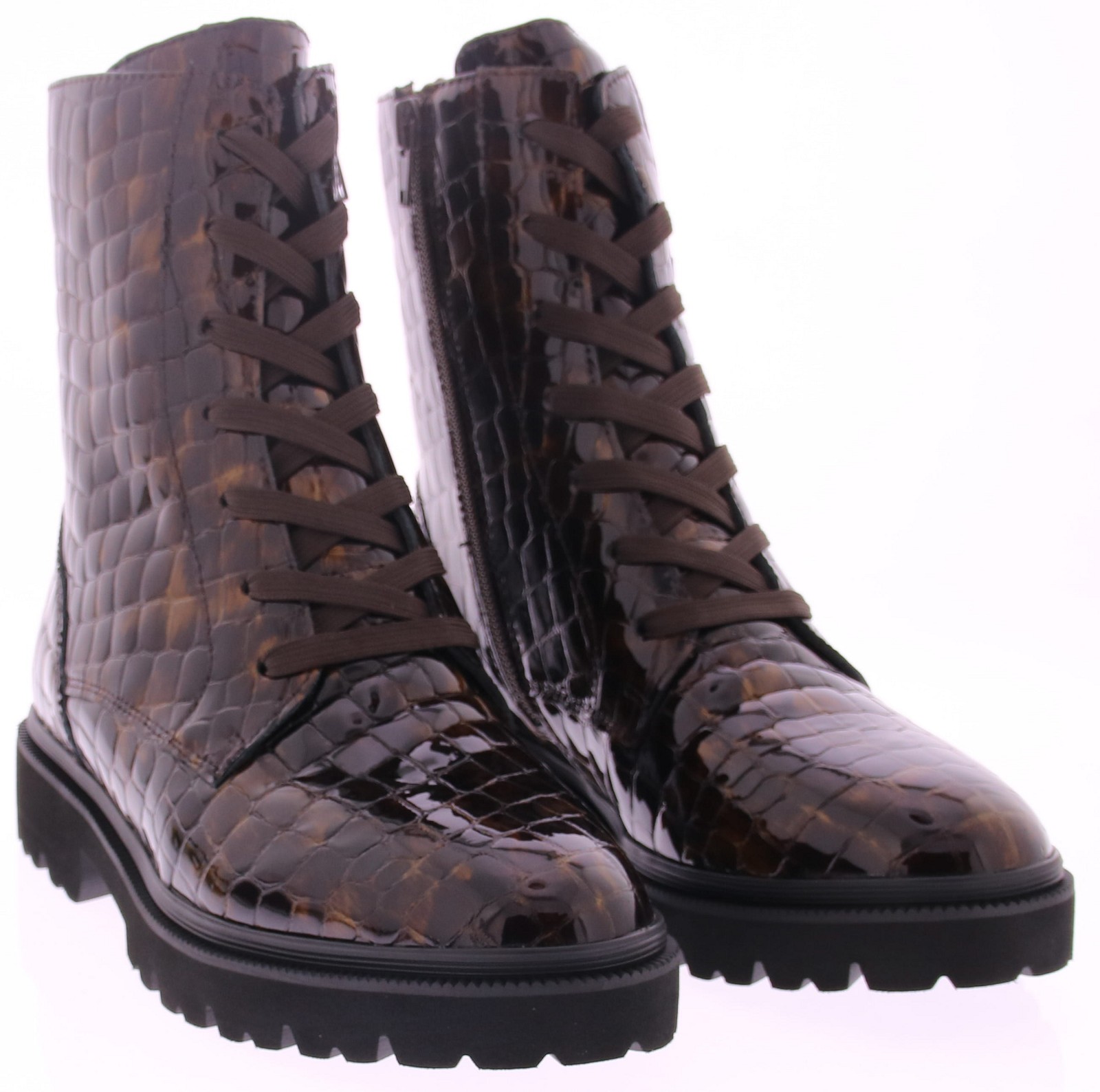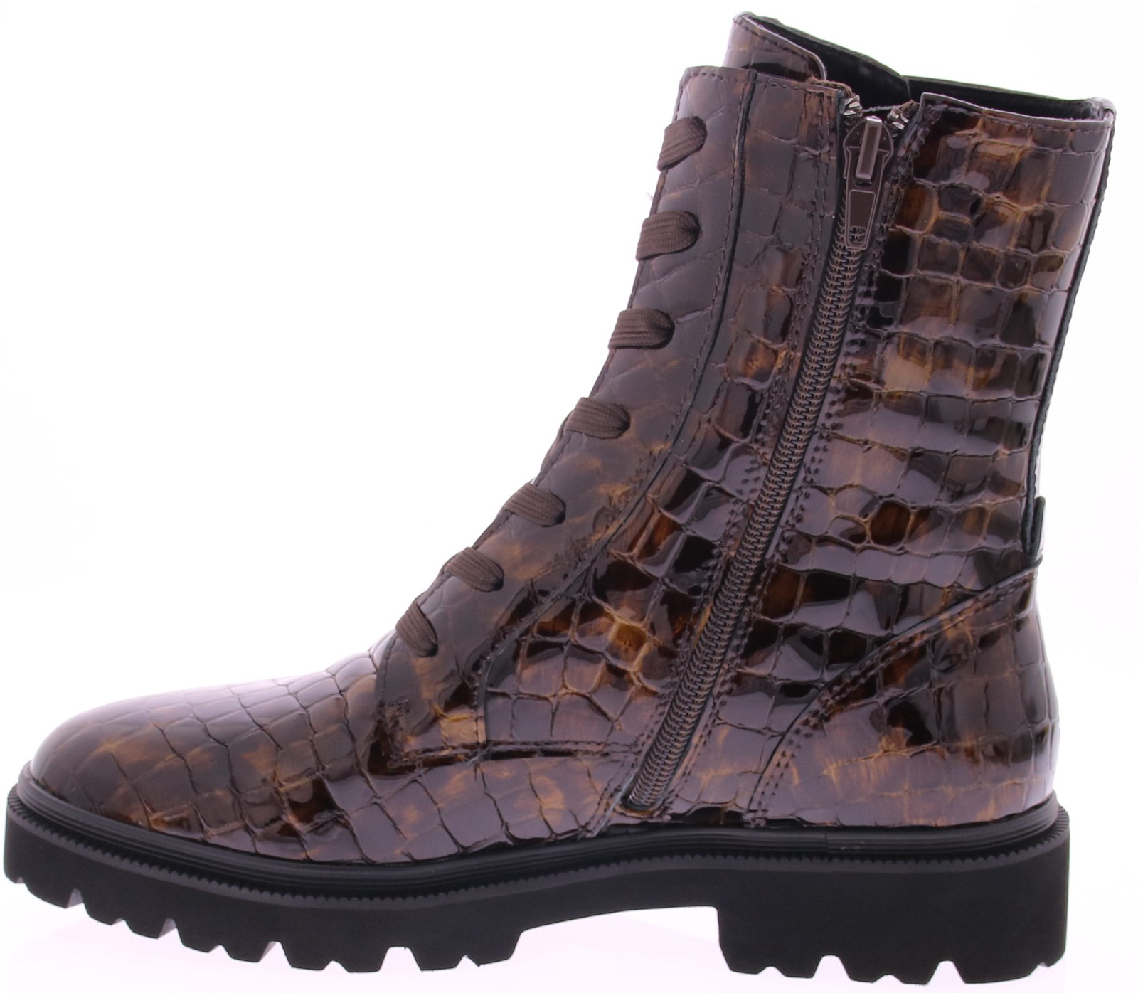 Bruine lak dames veterboot van RapidSoul. Stoer, stijlvol en opvallend - deze bruine veterboot van Di Lauro is een echte eyecatcher. Uitgevoerd in glanzend lakleer met een luxe crocoprint, geeft deze boot elke outfit een edgy en moderne uitstraling. De robuuste profielzool zorgt voor grip en comfort, terwijl de ritssluiting aan de zijkant het aan- en uittrekken moeiteloos maakt.